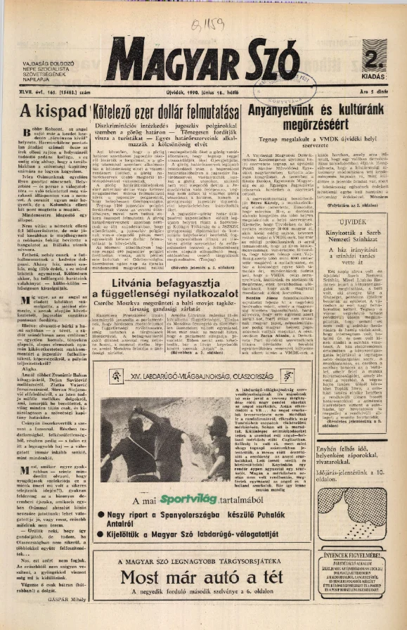 Magyar Szó, 47. évf. 1990. június 18. 165. sz. 1–20. oldal