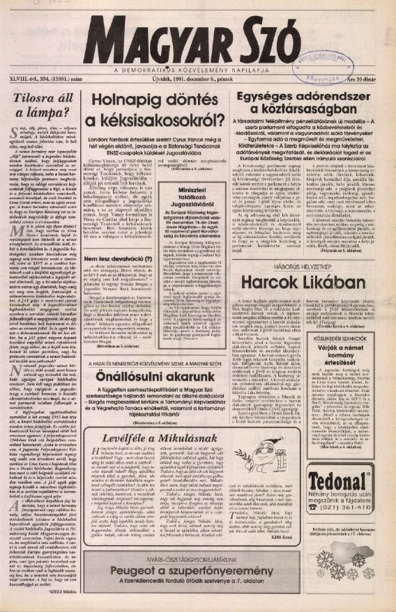 Magyar Szó, 48. évf. 1991. december 6. 334. sz. 1–20. oldal