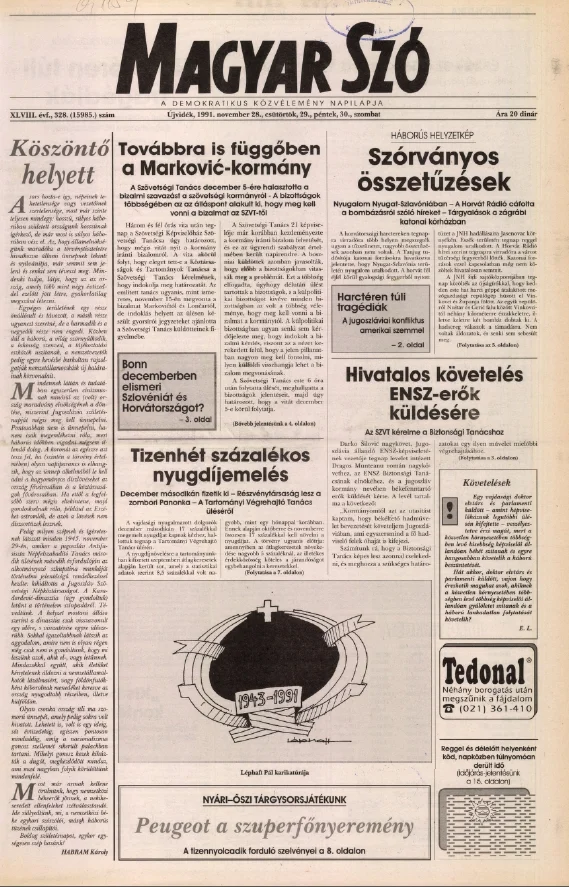 Magyar Szó, 48. évf. 1991. november 28. – 30. 328. sz. 1–20. oldal