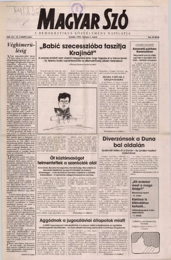 Magyar Szó, 49. évf. 1992. február 4. 33. sz. 1–20. oldal