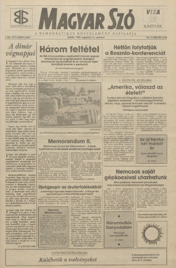 Magyar Szó, 50. évf. 1993. augusztus 14. 219. sz. 1–16. oldal
