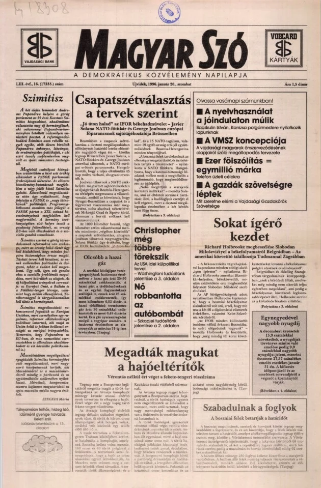 Magyar Szó, 53. évf. 1996. január 20. 16. sz. 1–16. oldal
