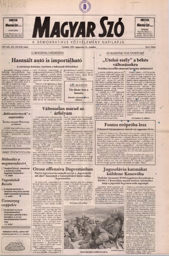 Magyar Szó, 56. évf. 1999. augusztus 14. 181. sz. 1–16. oldal