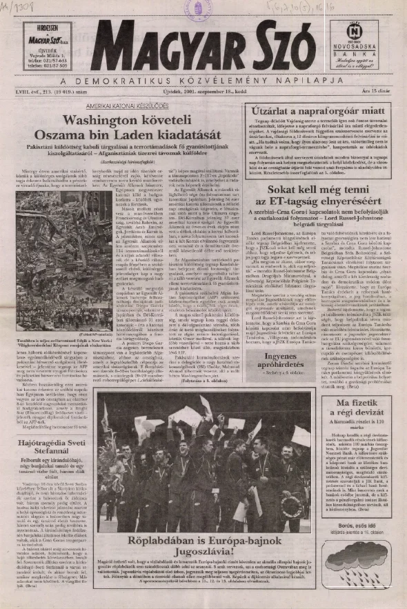Magyar Szó, 58. évf. 2001. szeptember 18. 213. sz. 1–16. oldal