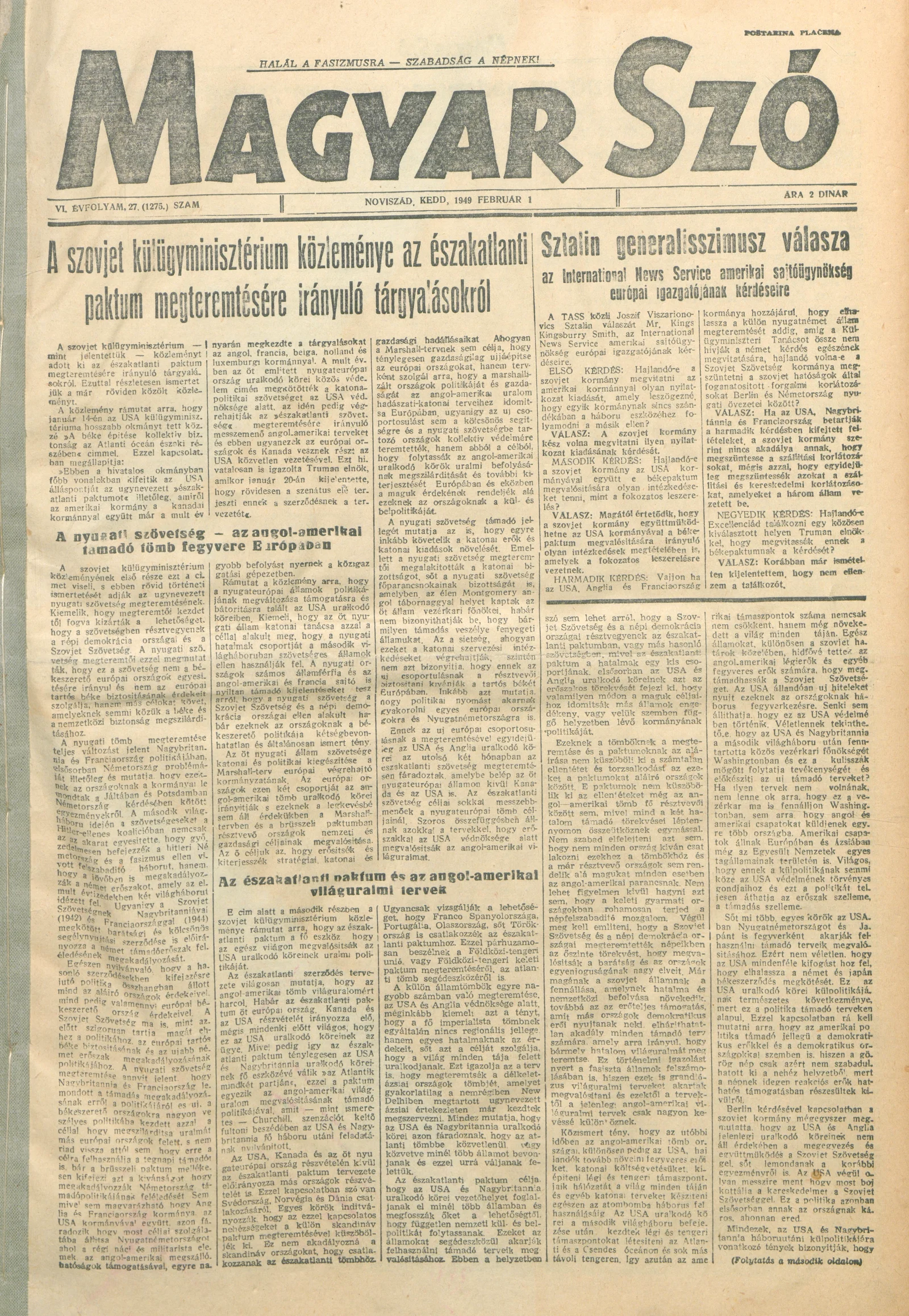 Magyar Szó, 6. évf. 1949. február 1. 27. sz. 1–4. oldal