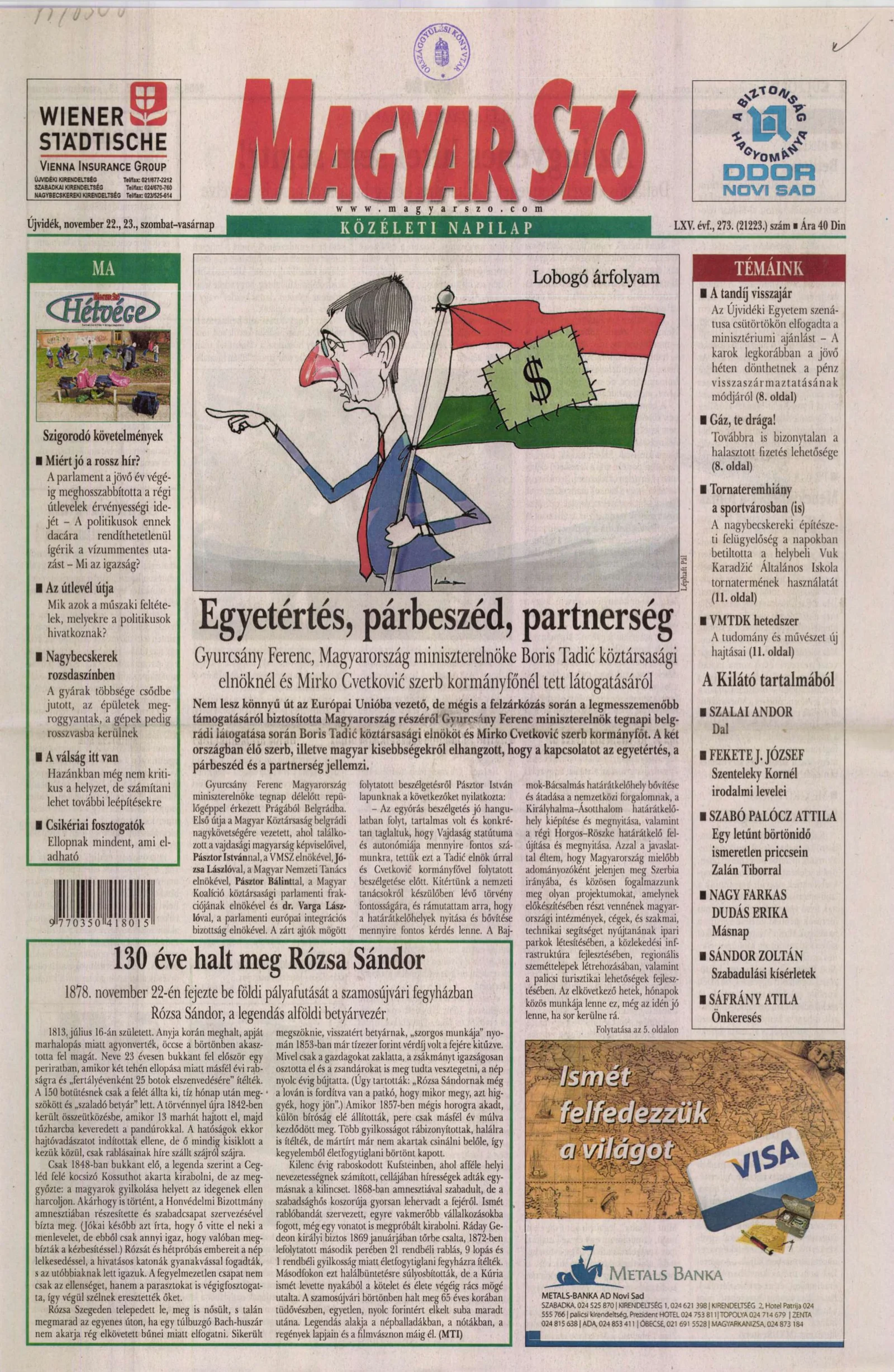 Magyar Szó, 65. évf. 2008. november 22. – 23. 273. sz. 1–28. oldal