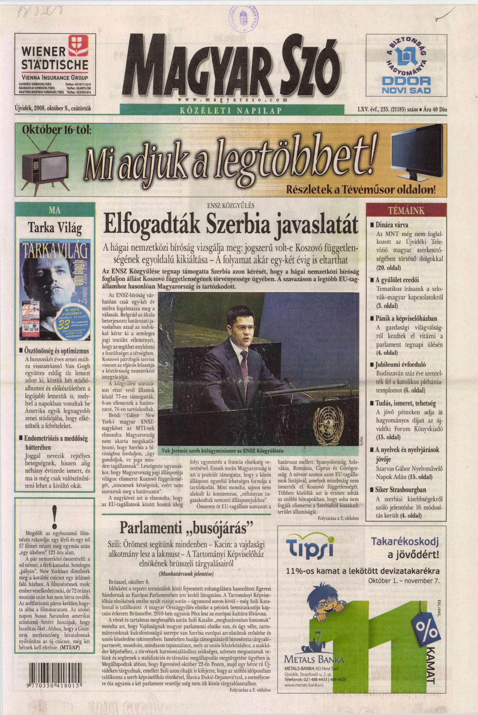 Magyar Szó, 65. évf. 2008. október 9. 235. sz. 1–20. oldal