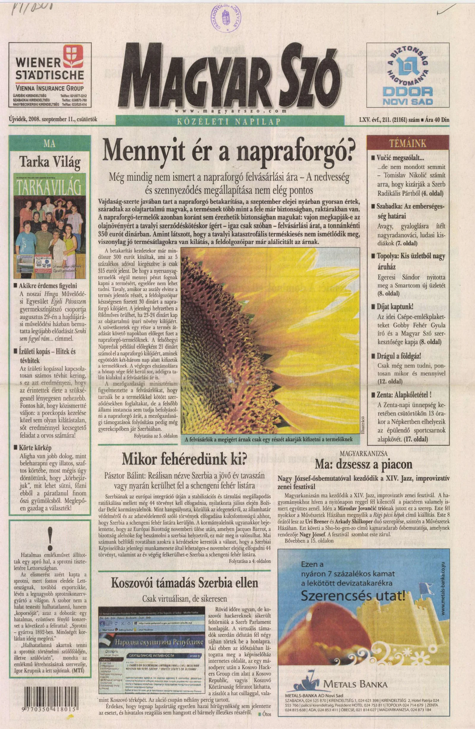 Magyar Szó, 65. évf. 2008. szeptember 11. 211. sz.