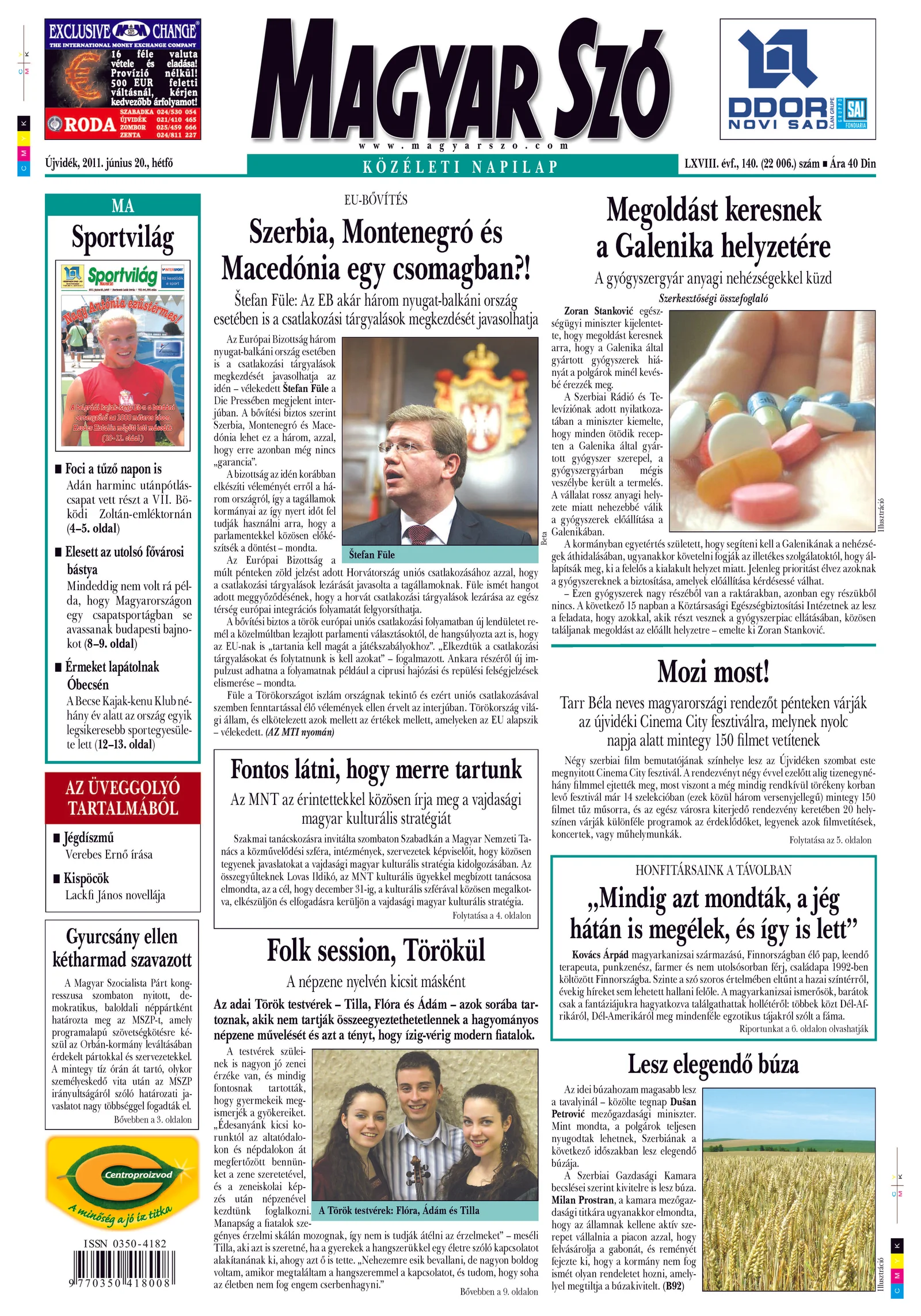Magyar Szó, 68. évf. 2011. június 20. 140. sz. 1–16. oldal