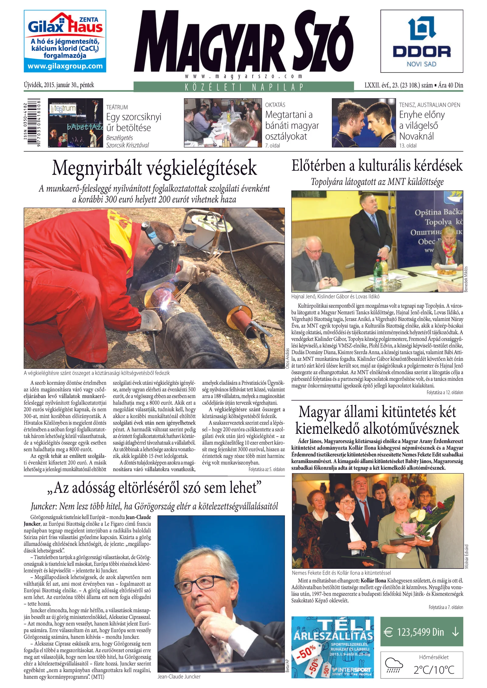 Magyar Szó, 72. évf. 2015. január 30. 23. sz. 1. oldal