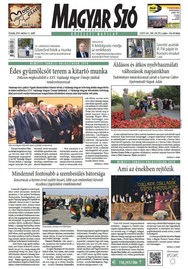 Magyar Szó, 75. évf. 2018. október 15. 240. sz. 1–20. oldal