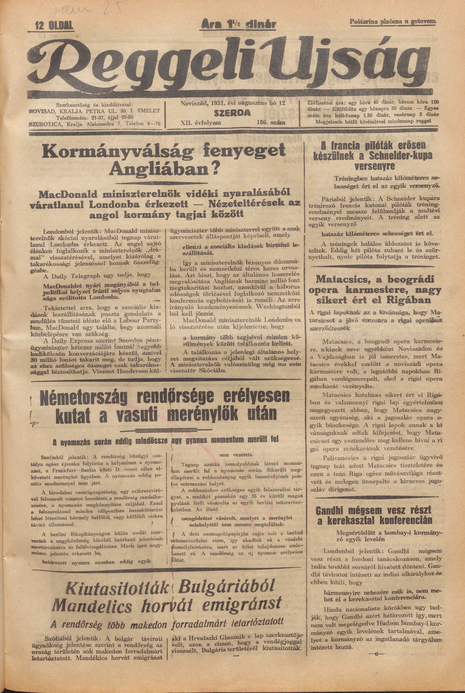 Reggeli Újság, 12. évf. 1931. augusztus 12. 186. sz.