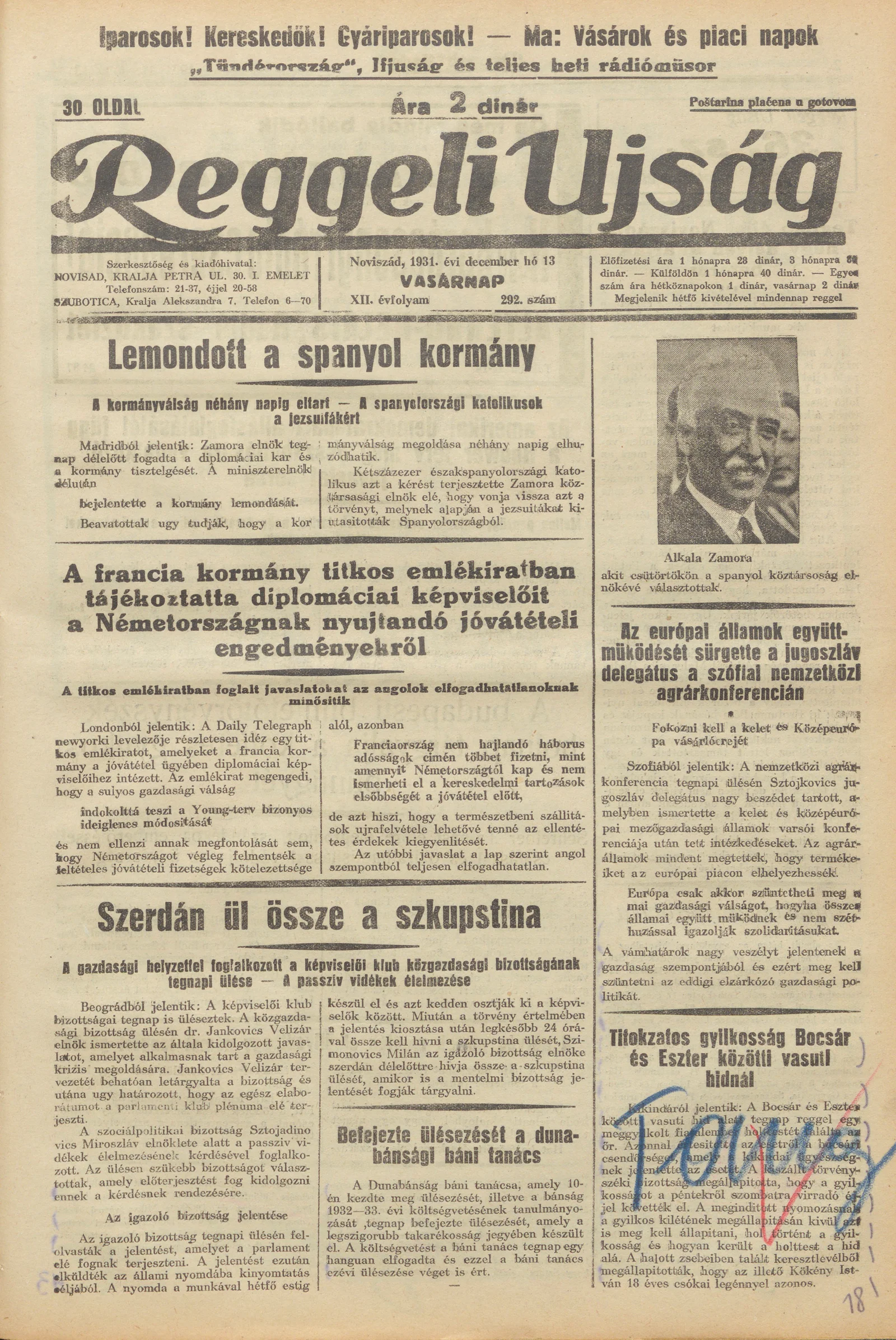 Reggeli Újság, 12. évf. 1931. december 13. 292. sz.