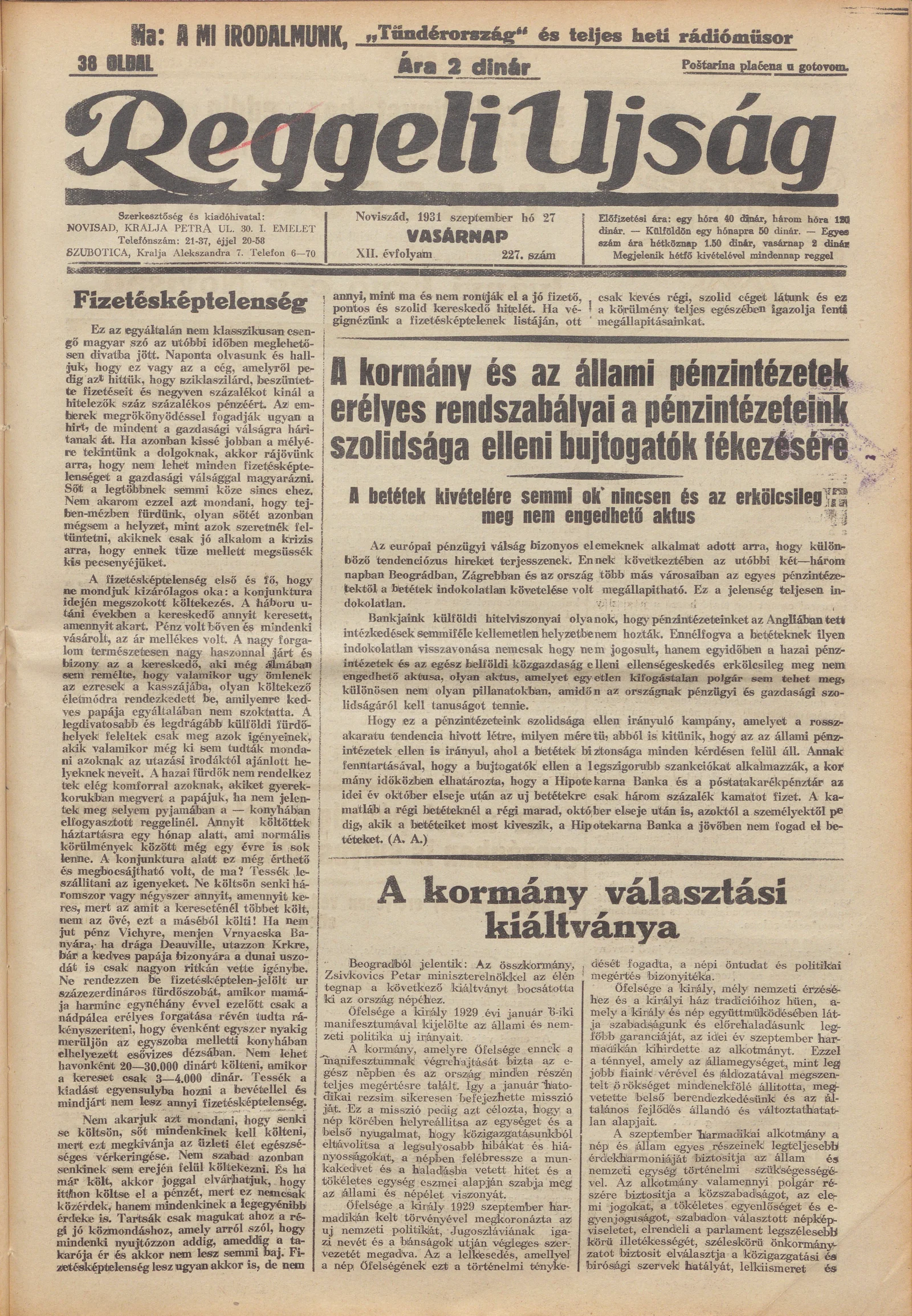 Reggeli Újság, 12. évf. 1931. szeptember 27. 227. sz.