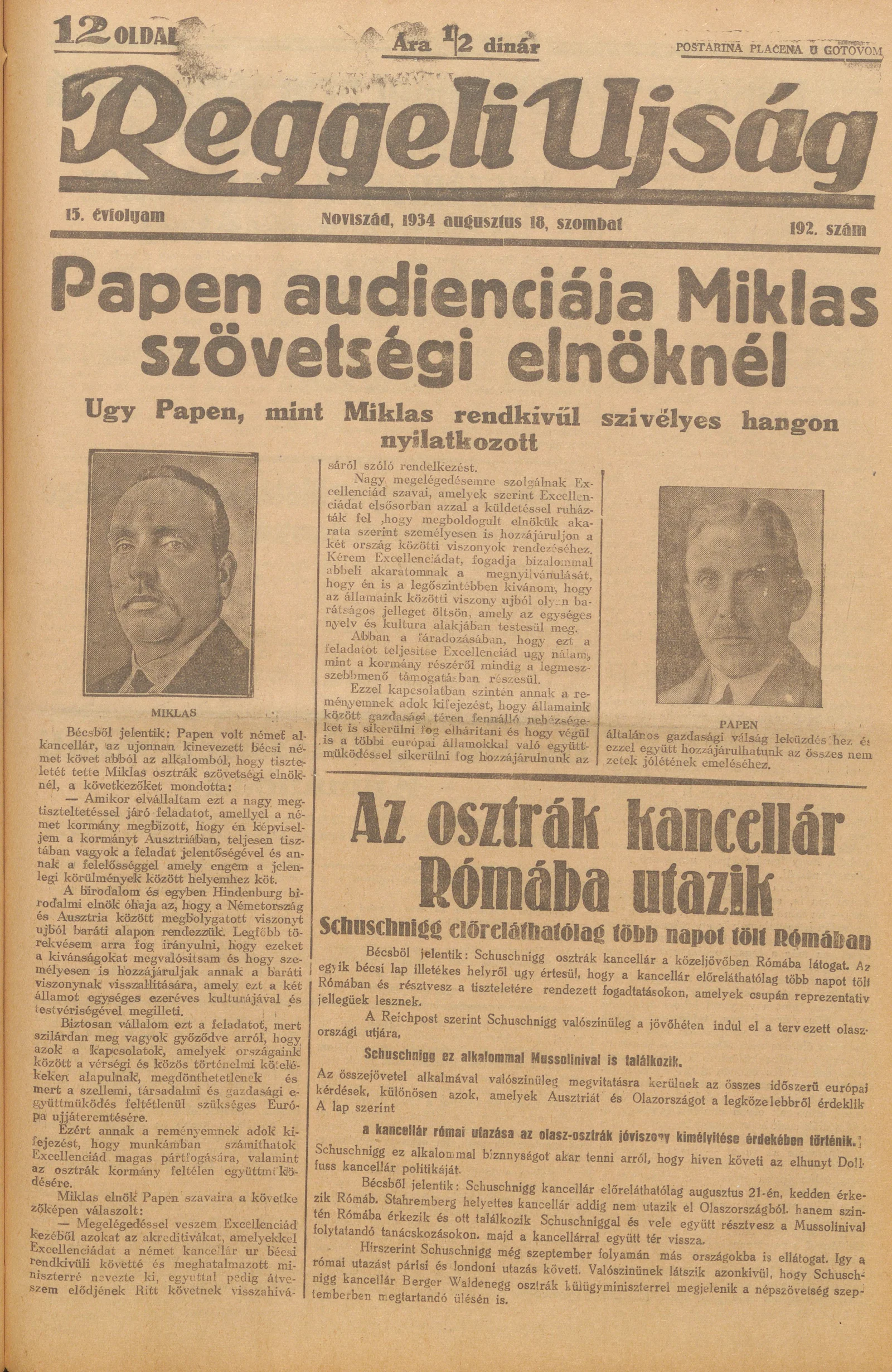 Reggeli Újság, 15. évf. 1934. augusztus 18. 192. sz.
