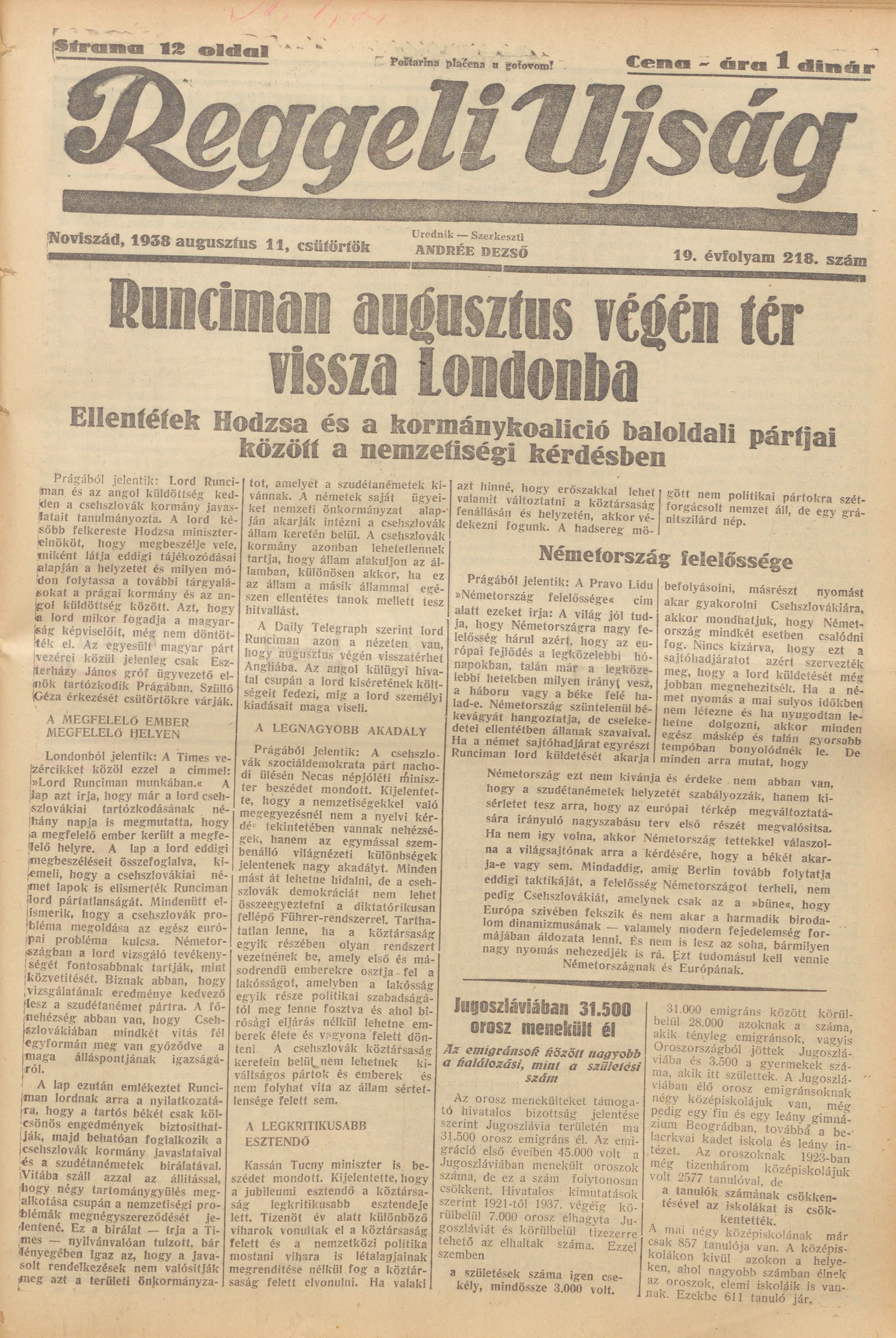 Reggeli Újság, 19. évf. 1938. augusztus 11. 218. sz.