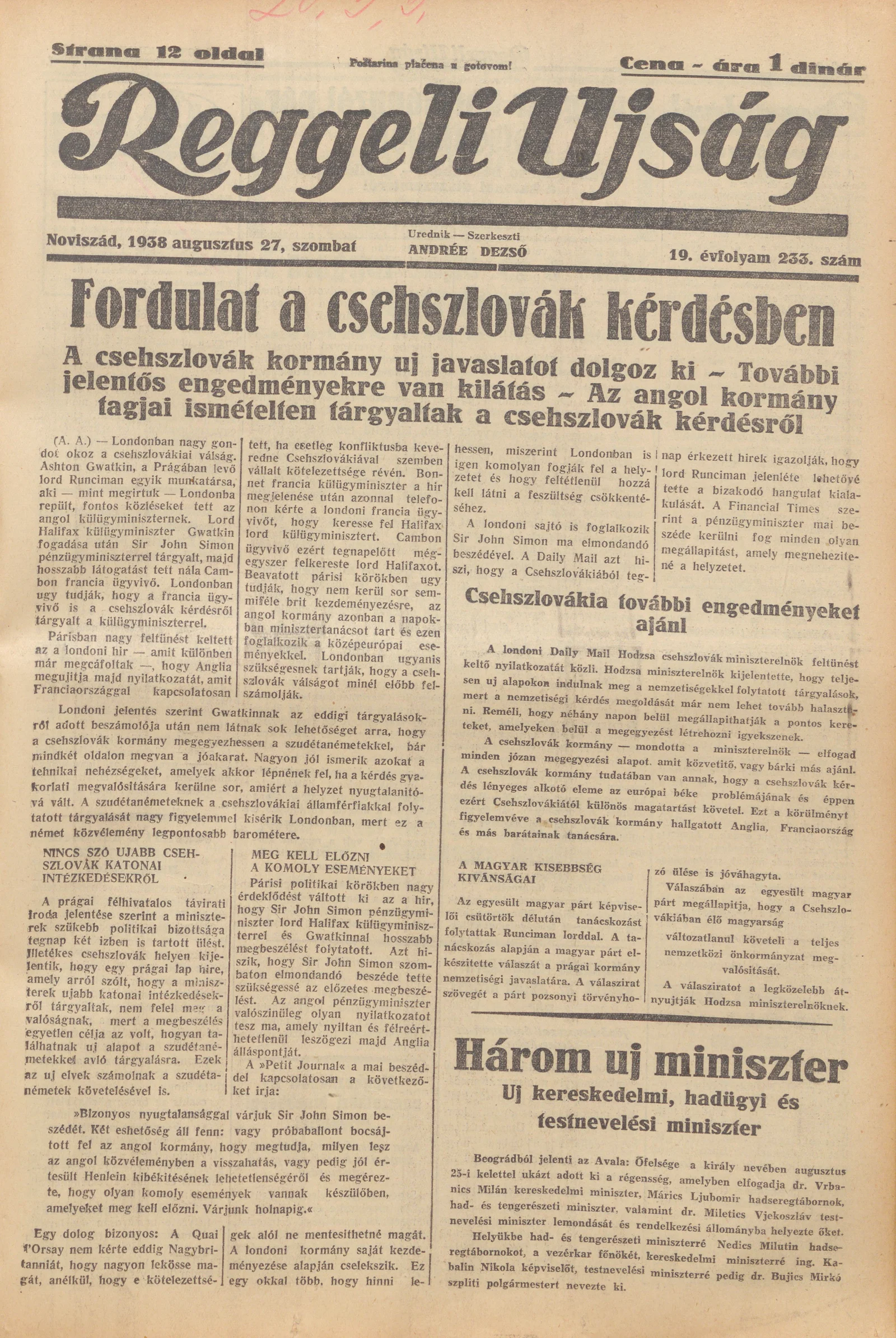 Reggeli Újság, 19. évf. 1938. augusztus 27. 233. sz.
