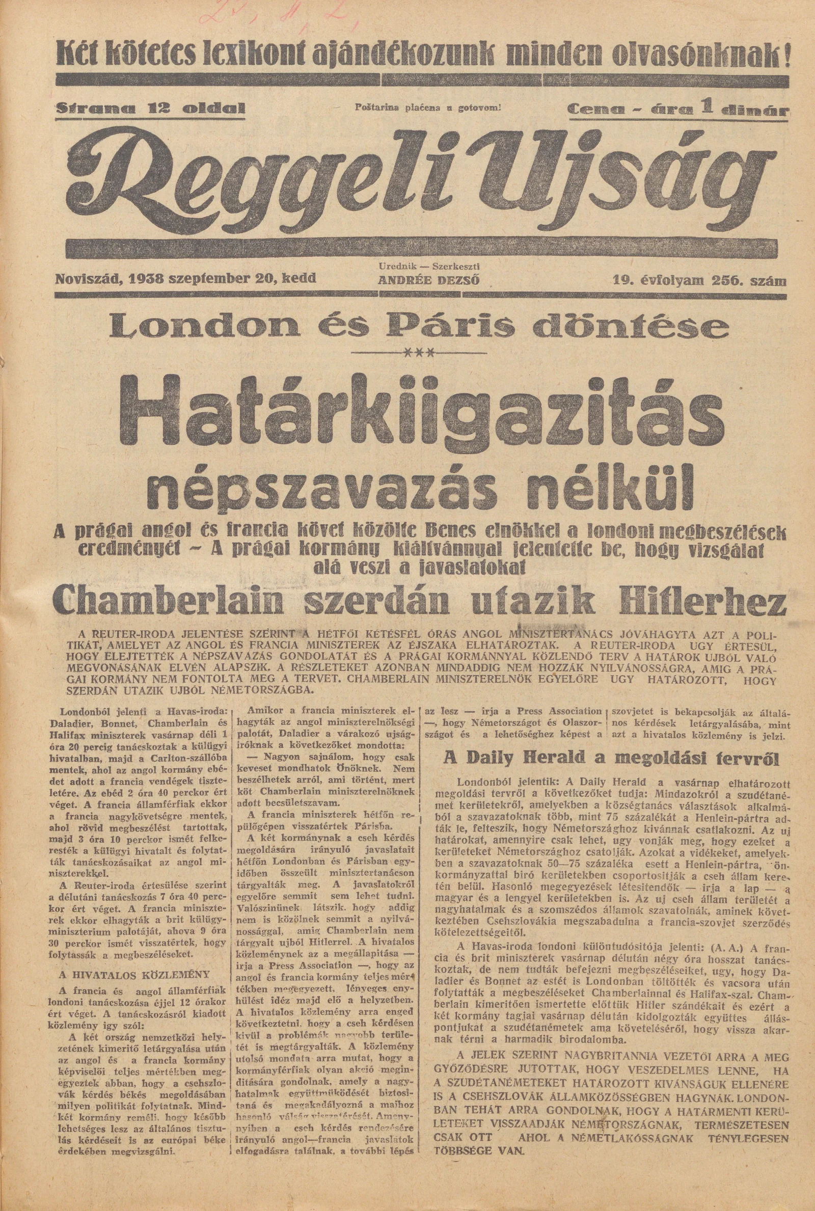 Reggeli Újság, 19. évf. 1938. szeptember 20. 256. sz.