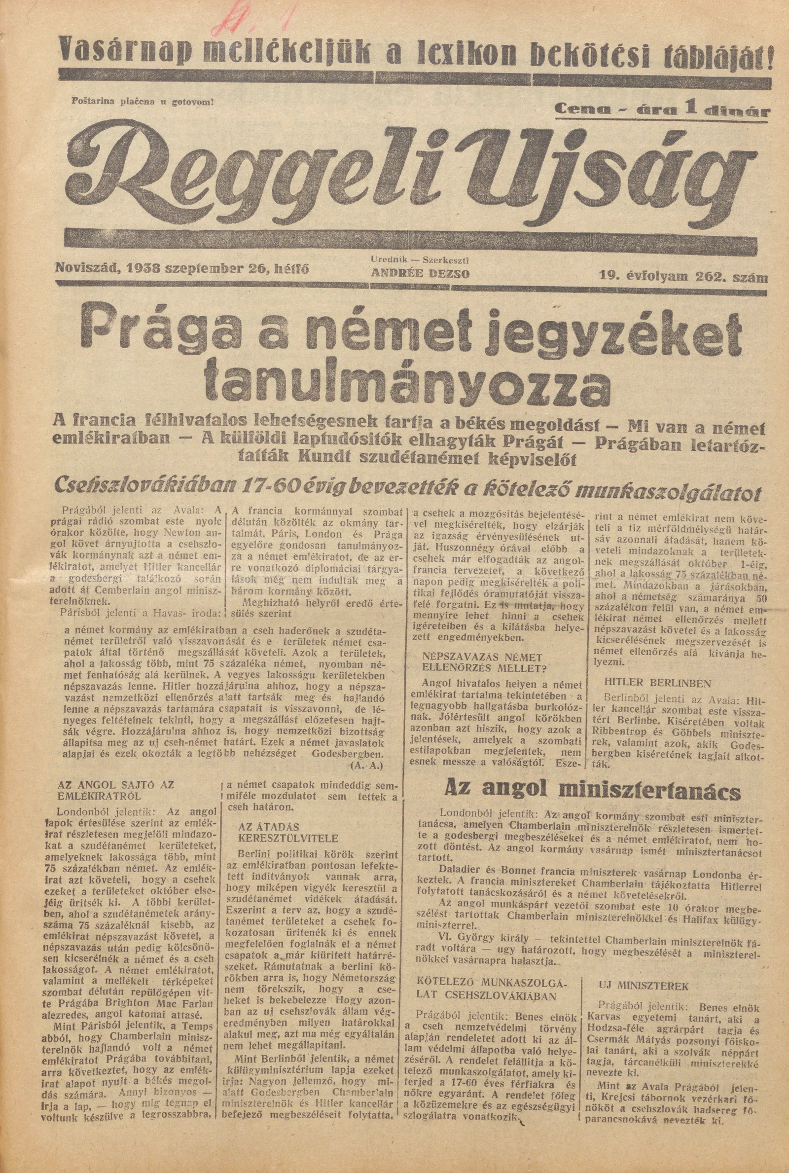 Reggeli Újság, 19. évf. 1938. szeptember 26. 262. sz.