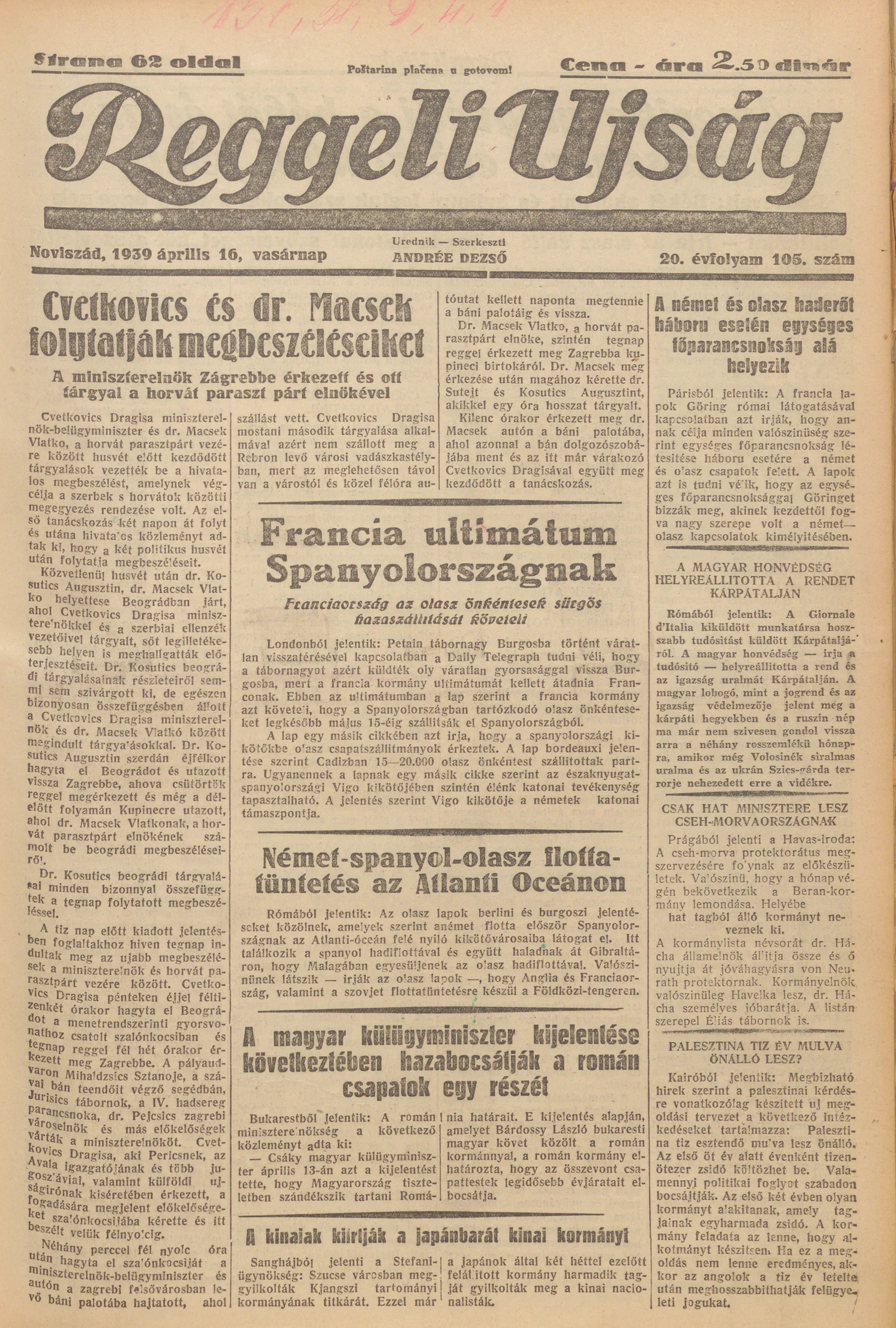 Reggeli Újság, 20. évf. 1939. április 16. 105. sz.