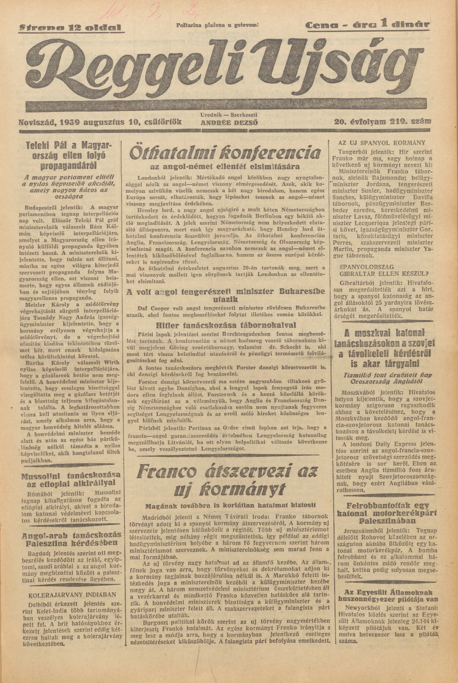 Reggeli Újság, 20. évf. 1939. augusztus 10. 219. sz.