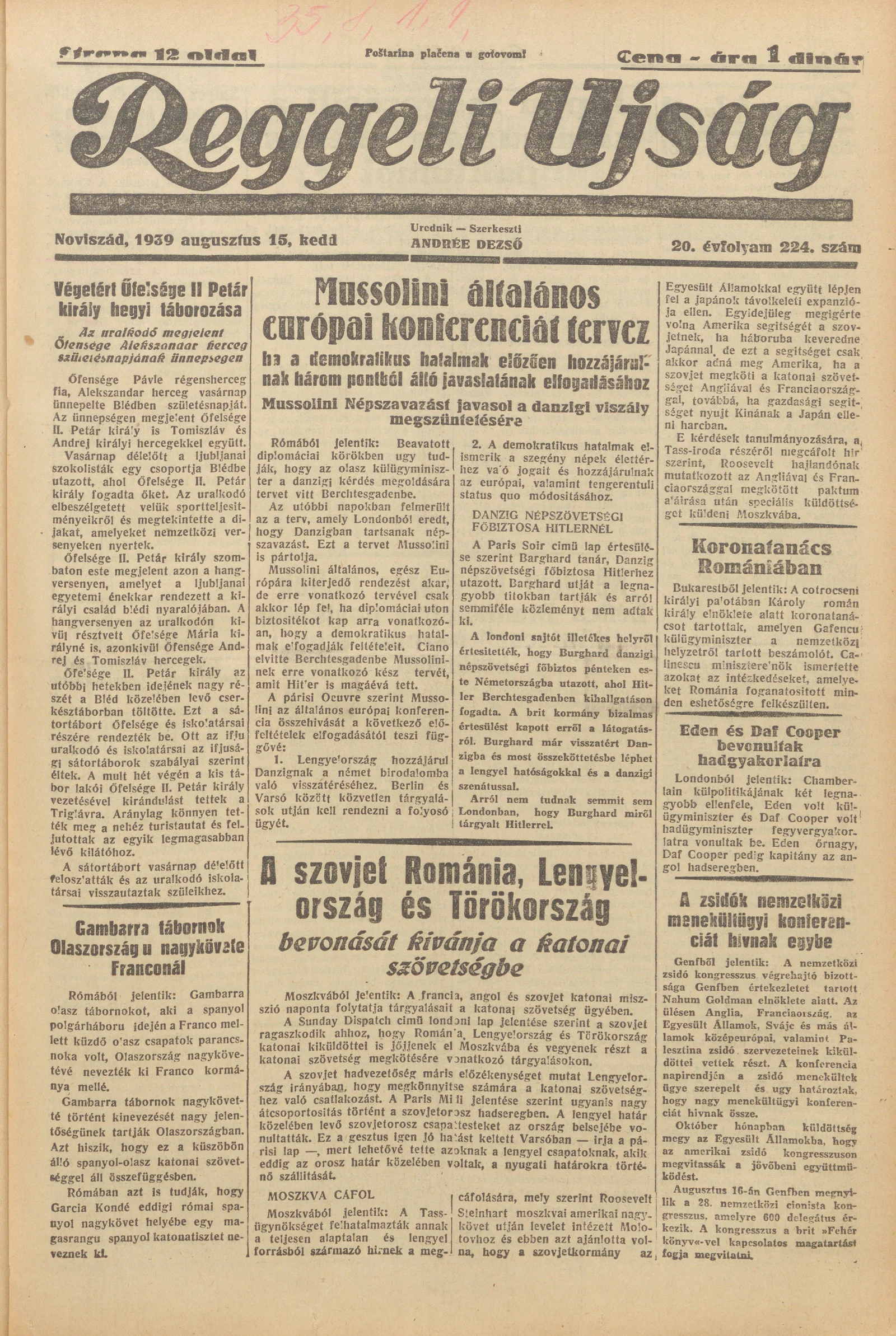 Reggeli Újság, 20. évf. 1939. augusztus 15. 224. sz.
