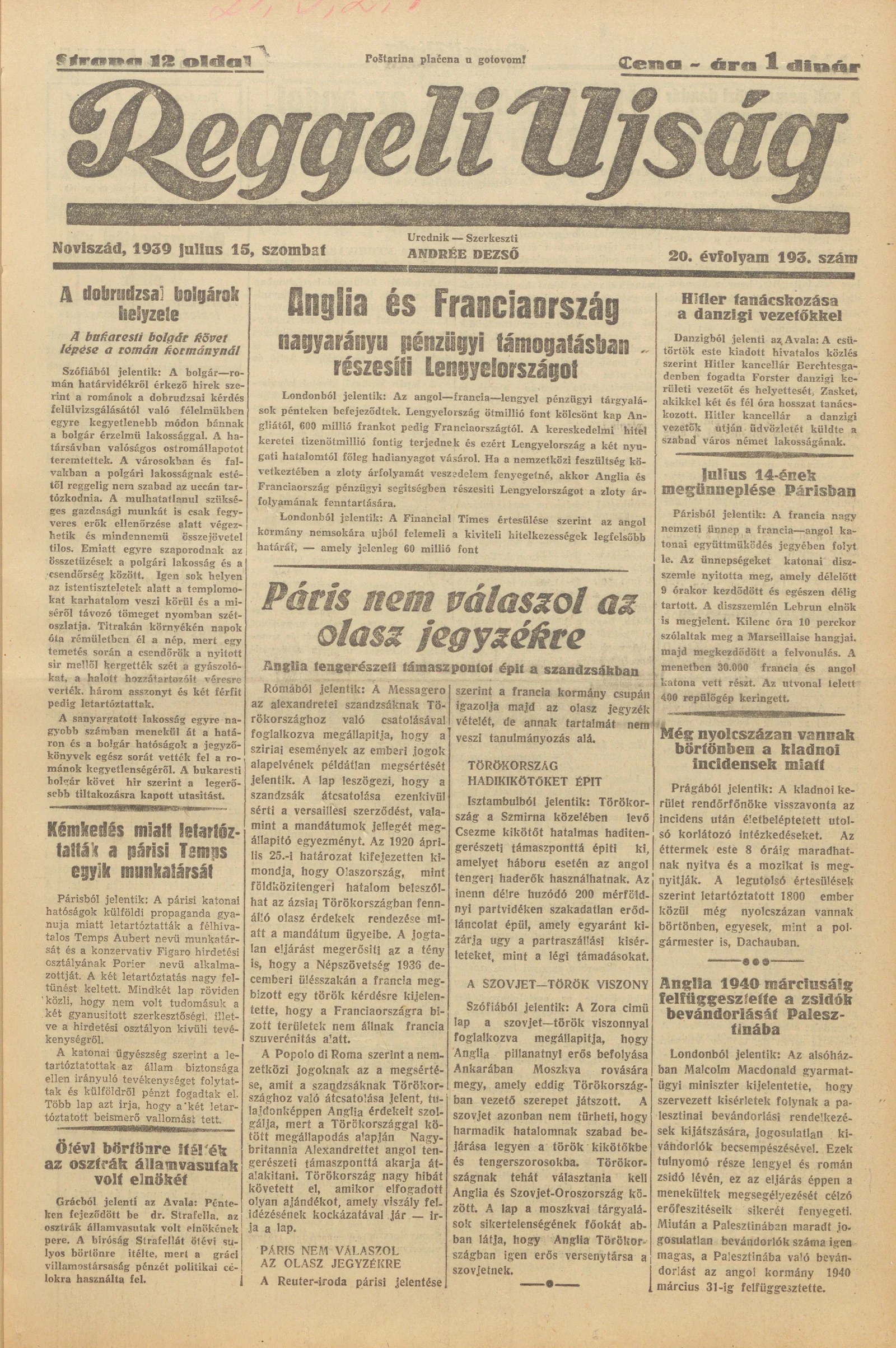Reggeli Újság, 20. évf. 1939. július 15. 193. sz.