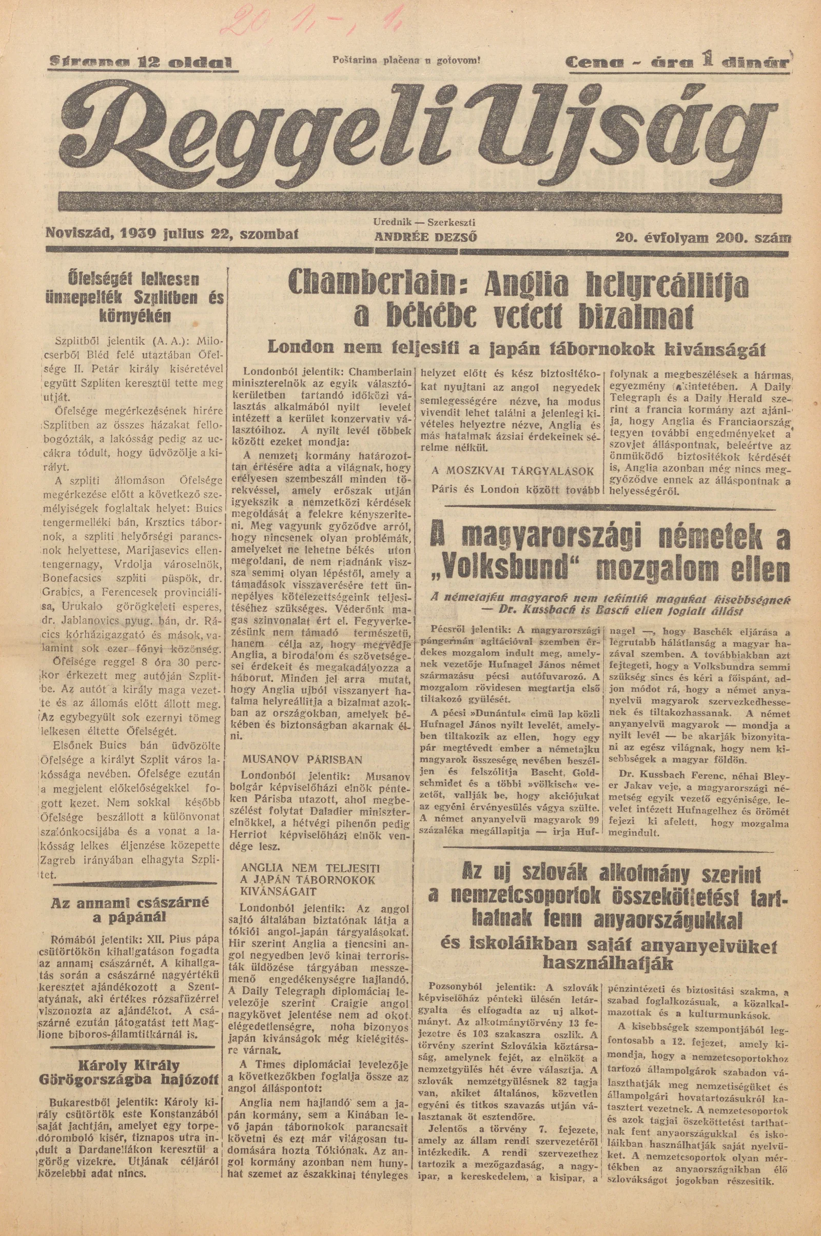 Reggeli Újság, 20. évf. 1939. július 22. 200. sz.