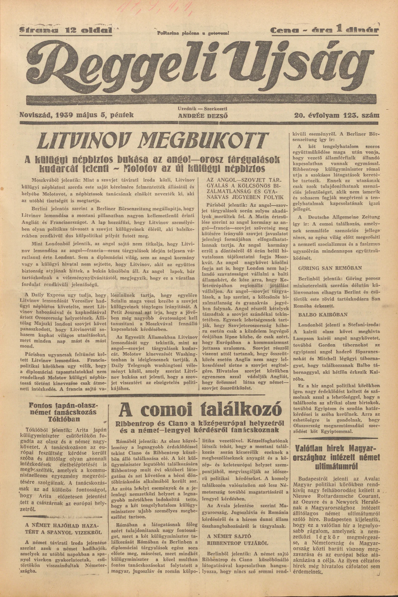 Reggeli Újság, 20. évf. 1939. május 5. 123. sz.