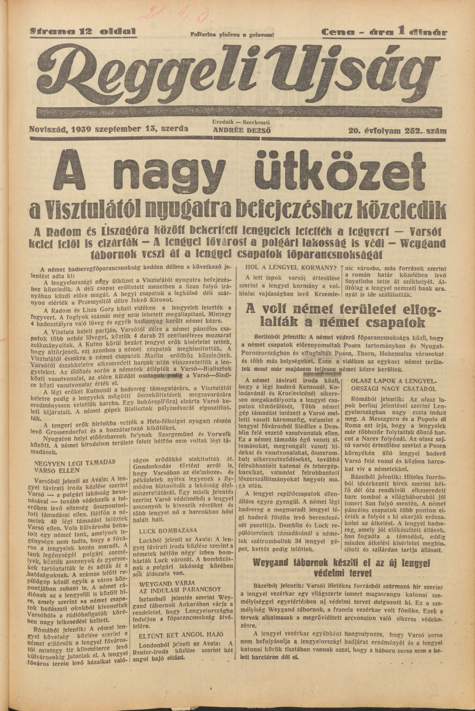 Reggeli Újság, 20. évf. 1939. szeptember 13. 252. sz.