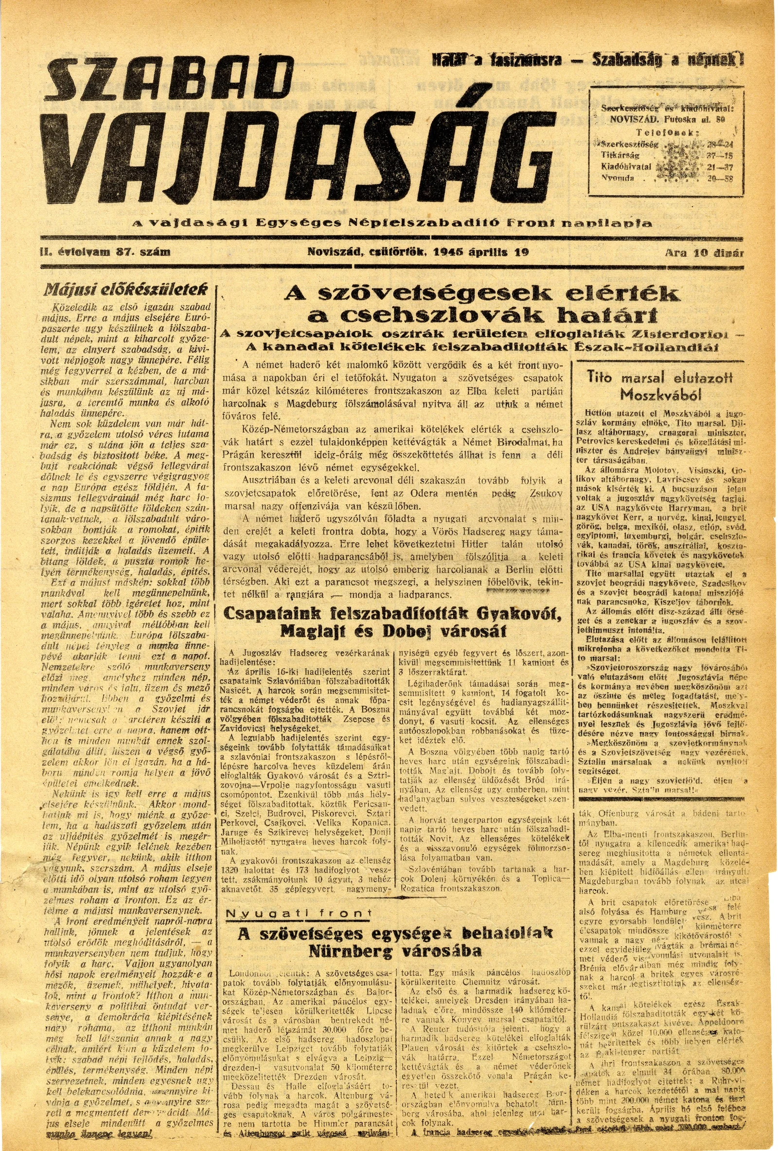 Szabad Vajdaság, 2. évf. 1945. április 19. 87. sz.