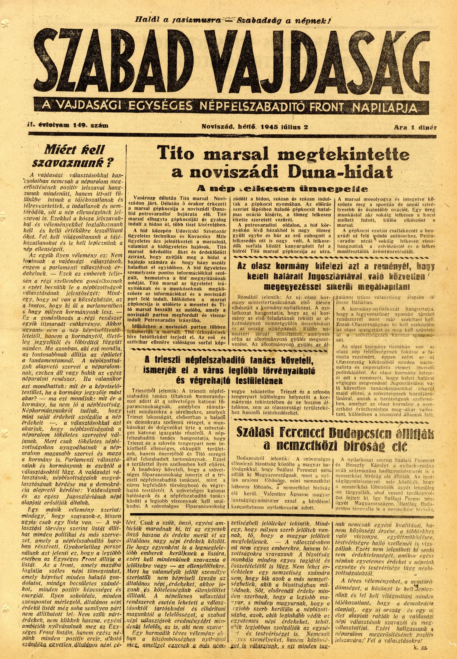 Szabad Vajdaság, 2. évf. 1945. július 2. 149. sz.