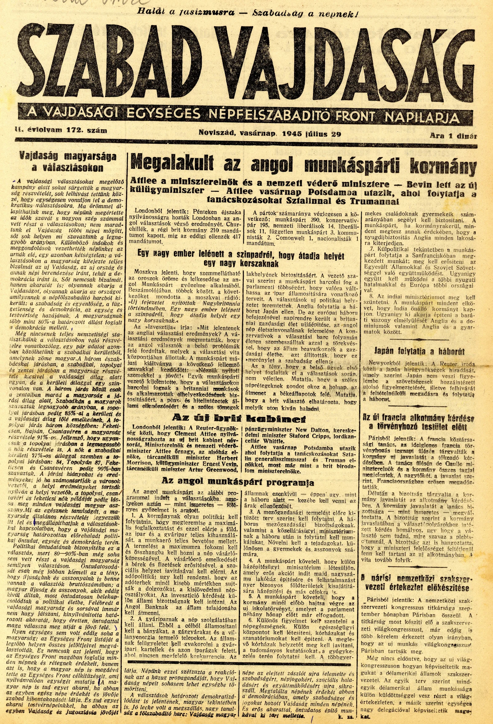 Szabad Vajdaság, 2. évf. 1945. július 29. 172. sz.