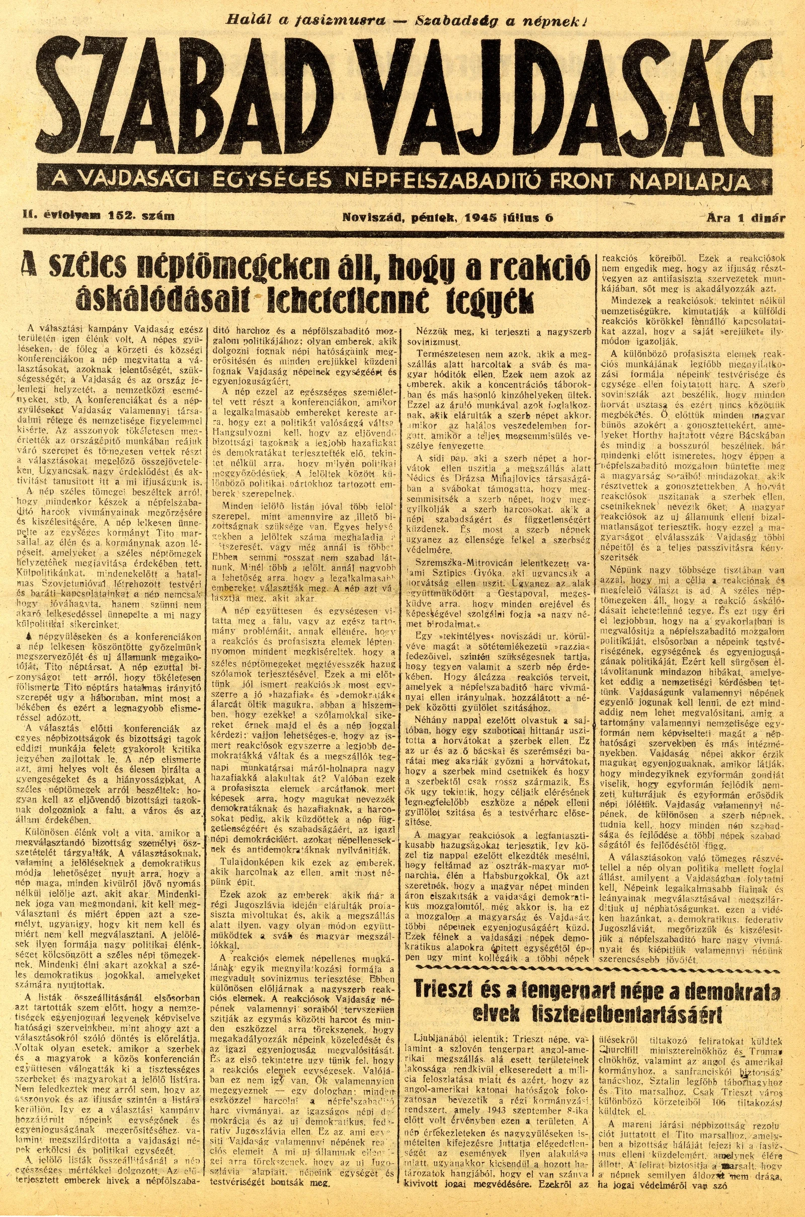 Szabad Vajdaság, 2. évf. 1945. július 6. 152. sz.