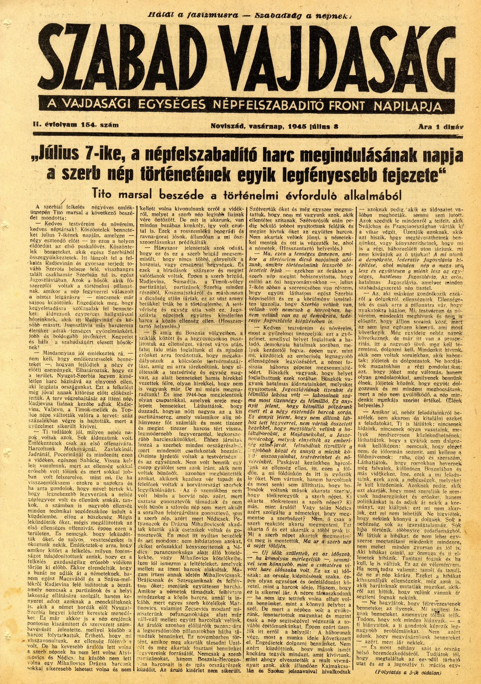 Szabad Vajdaság, 2. évf. 1945. július 8. 154. sz.