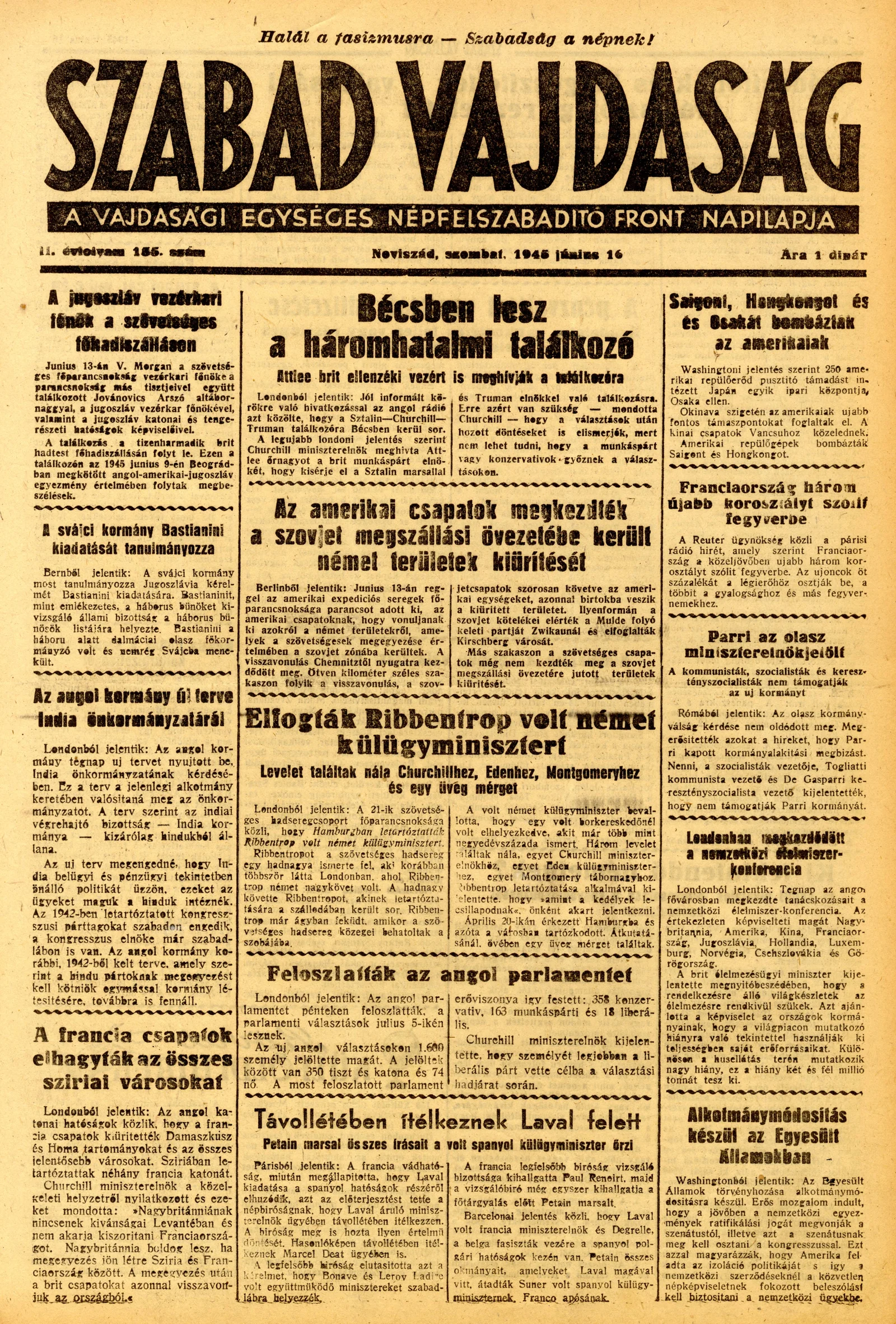 Szabad Vajdaság, 2. évf. 1945. június 16. 135. sz.