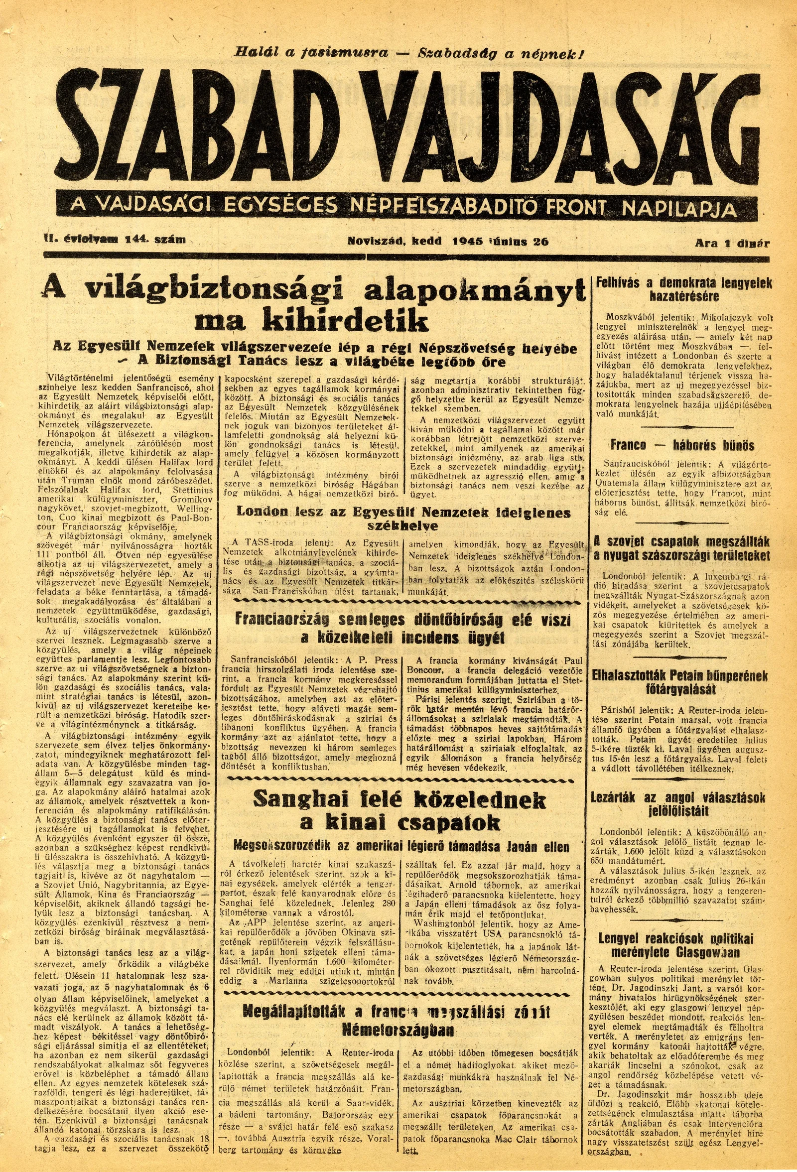 Szabad Vajdaság, 2. évf. 1945. június 26. 144. sz.