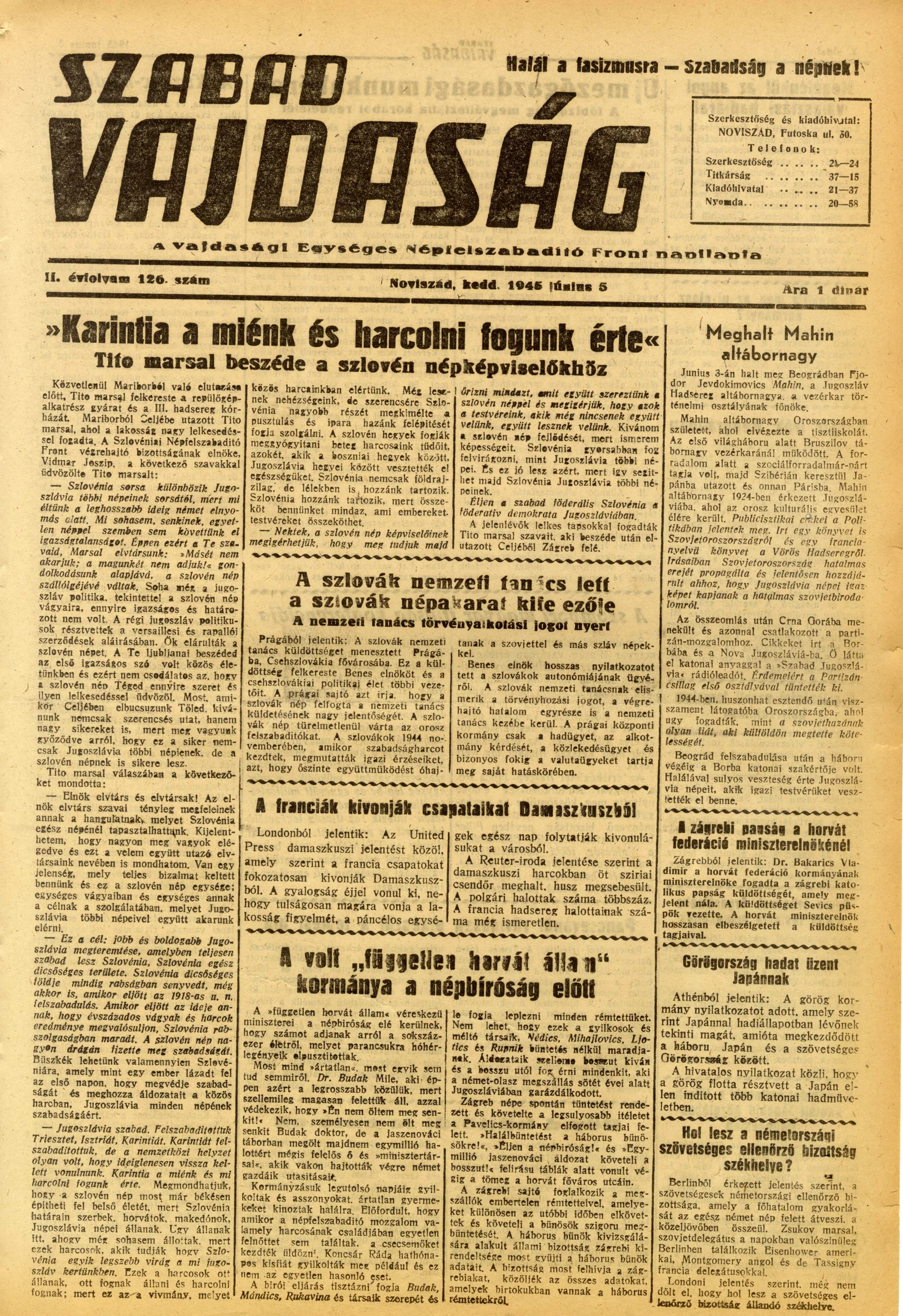 Szabad Vajdaság, 2. évf. 1945. június 5. 126. sz.