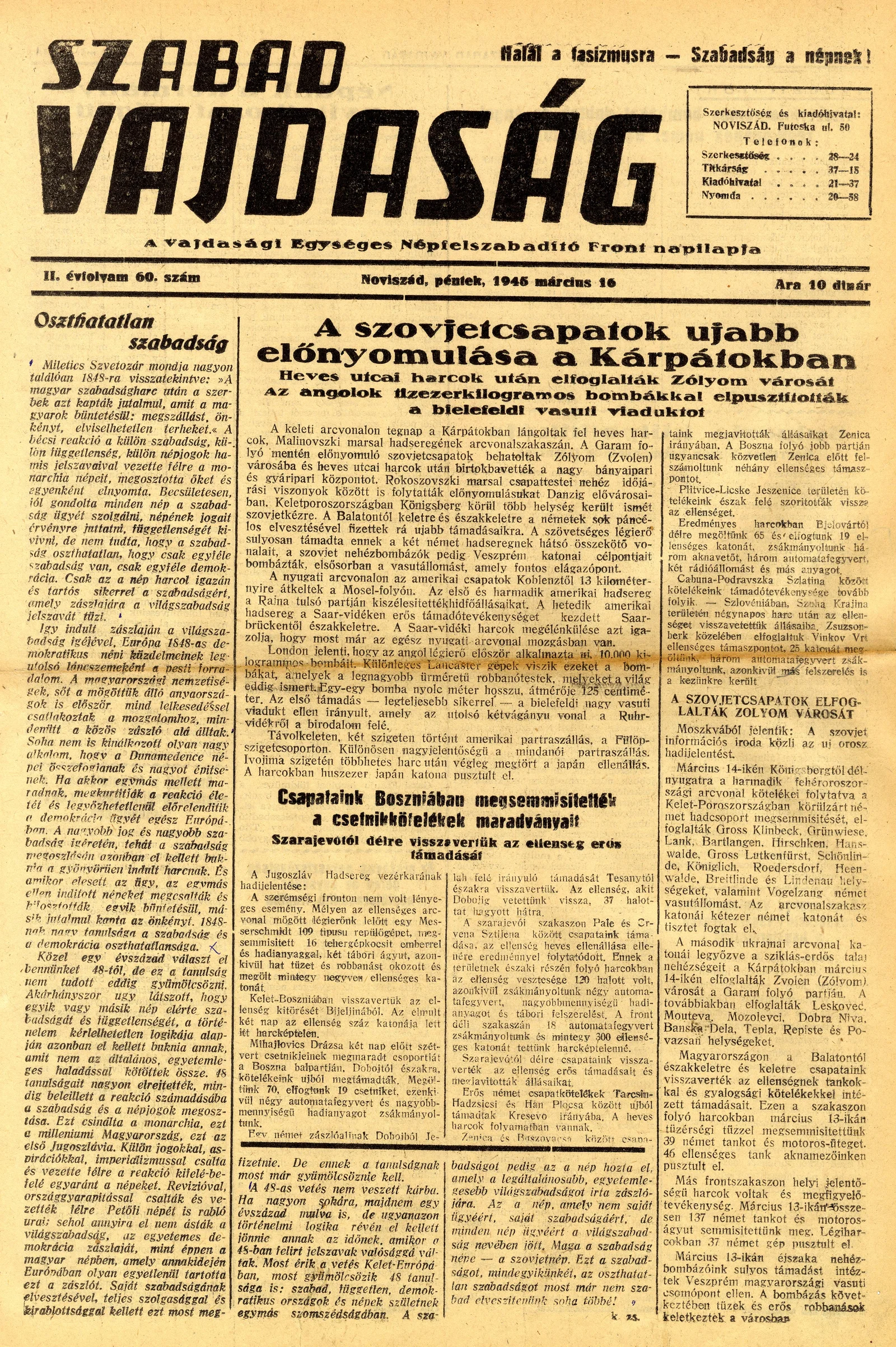 Szabad Vajdaság, 2. évf. 1945. március 16. 60. sz.