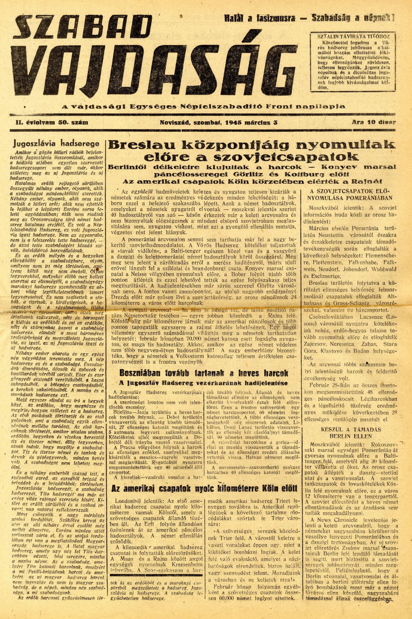 Szabad Vajdaság, 2. évf. 1945. március 3. 50. sz.