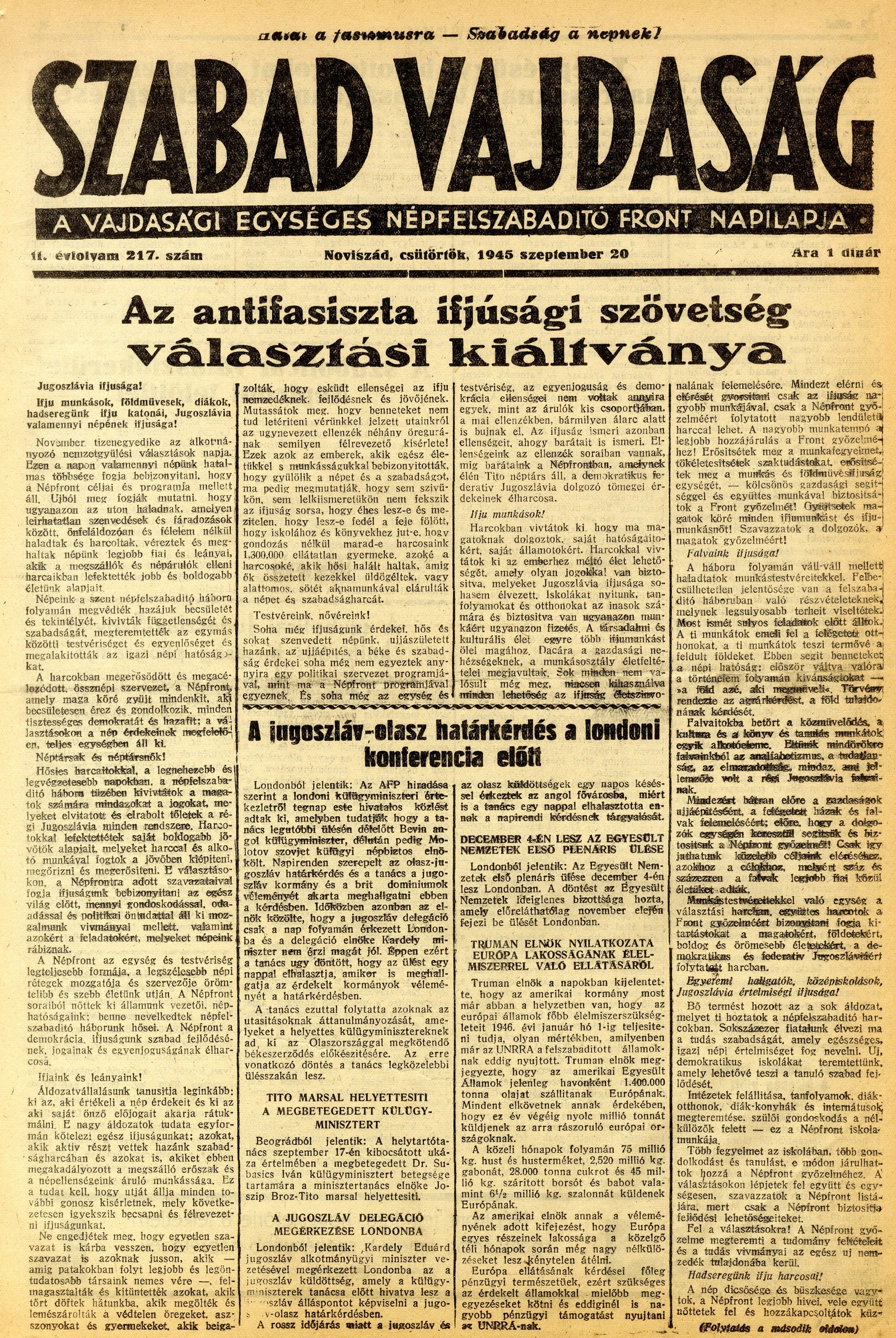 Szabad Vajdaság, 2. évf. 1945. szeptember 20. 217. sz.