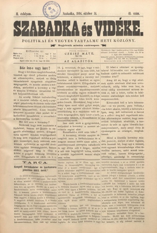 Szabadka és vidéke II, 2. évf. 1894. október 14. 41. sz.