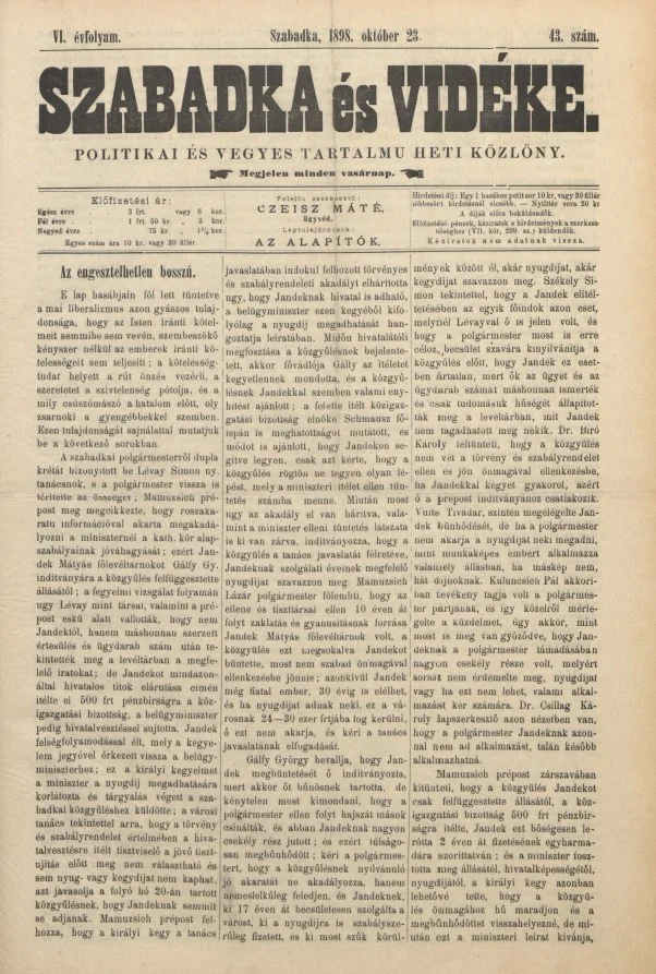 Szabadka és vidéke II, 6. évf. 1898. október 23. 43. sz.