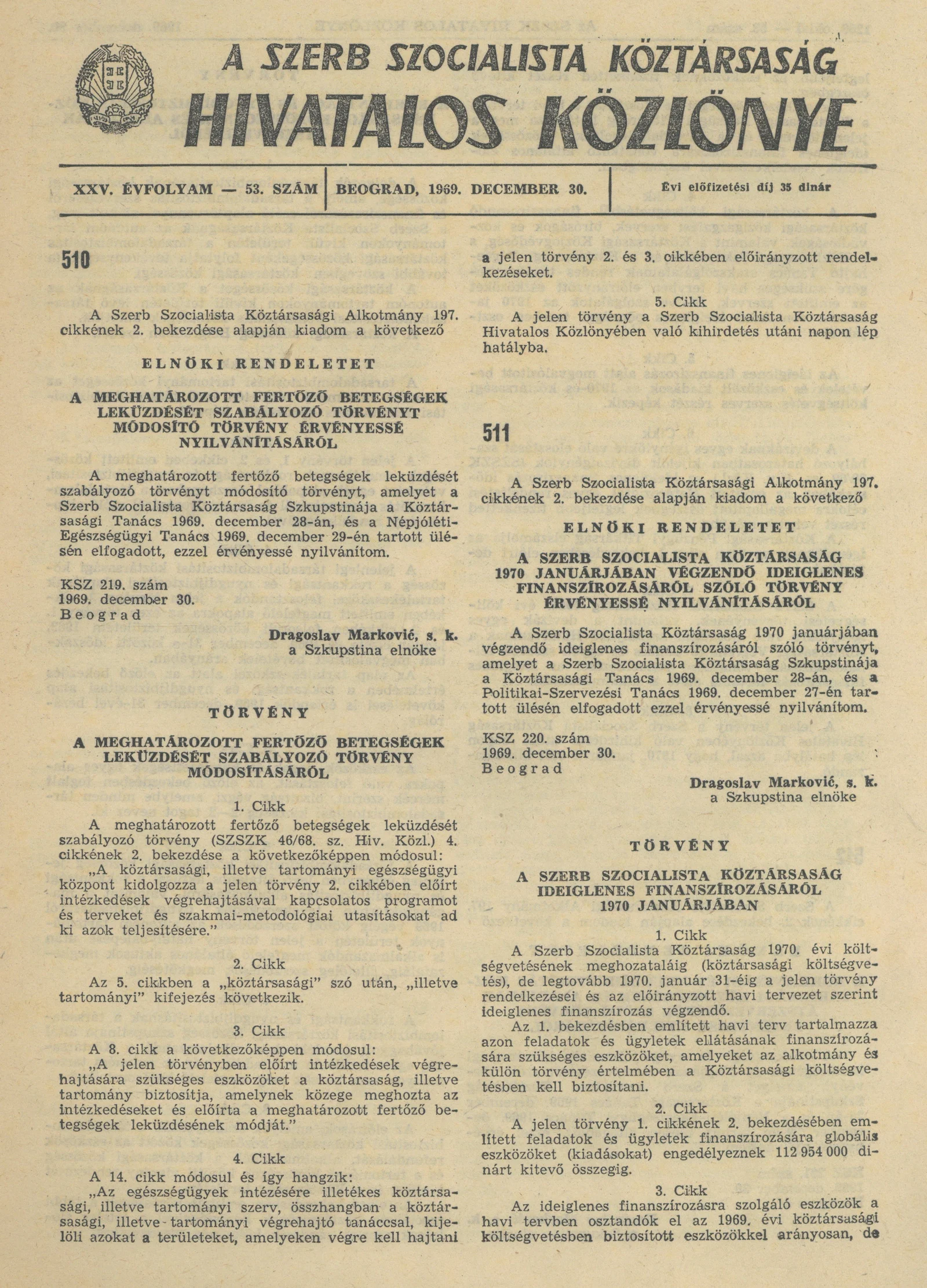 A Szerb Szocialista Köztársaság Hivatalos Közlönye, 25. évf. 1969. december 30. 53. sz. 1265–1280. oldal