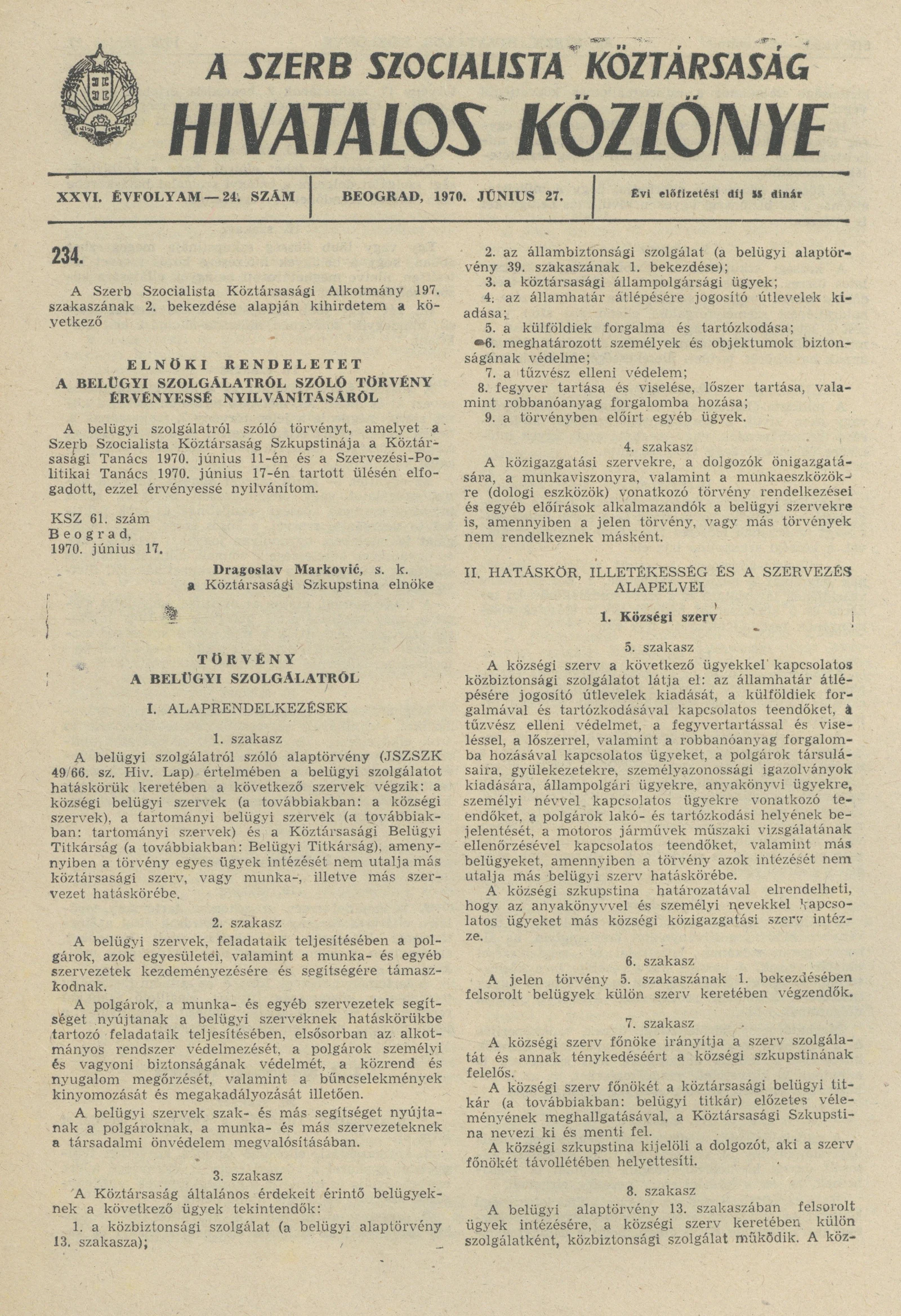 A Szerb Szocialista Köztársaság Hivatalos Közlönye, 26. évf. 1970. június 27. 24. sz. 617–624. oldal