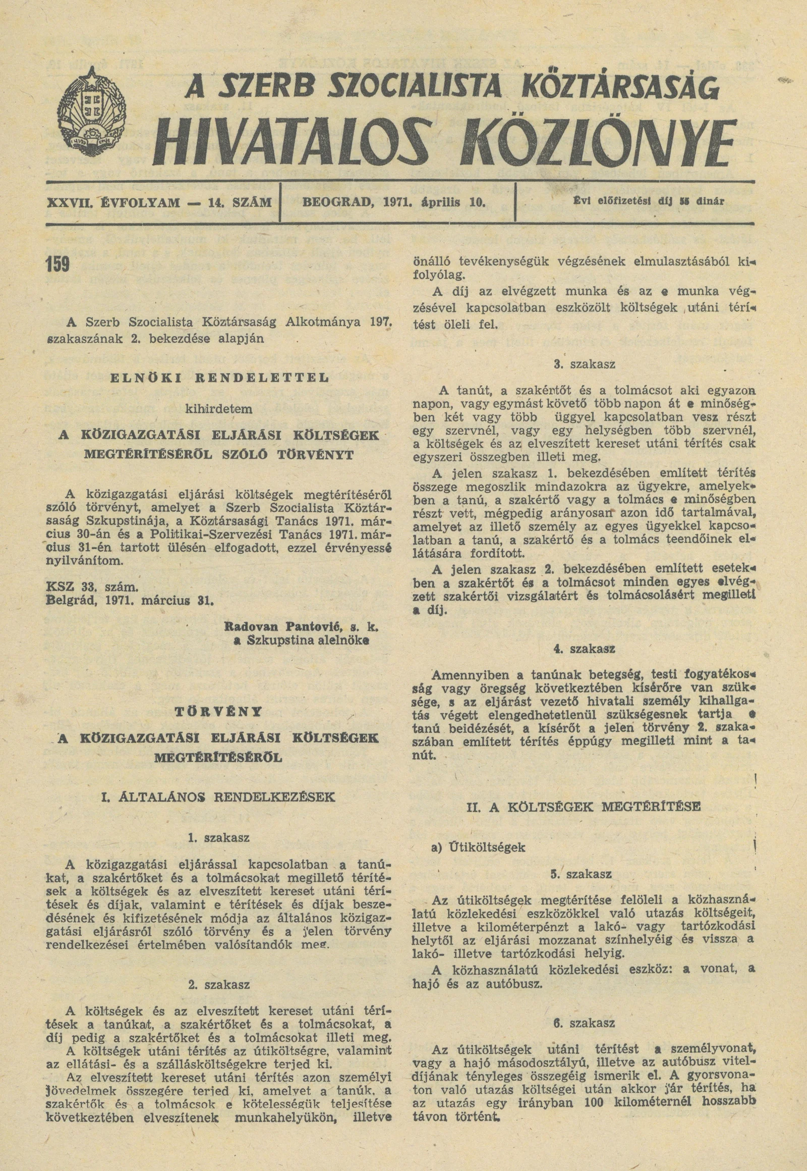 A Szerb Szocialista Köztársaság Hivatalos Közlönye, 27. évf. 1971. április 10. 14. sz. 337–348. oldal