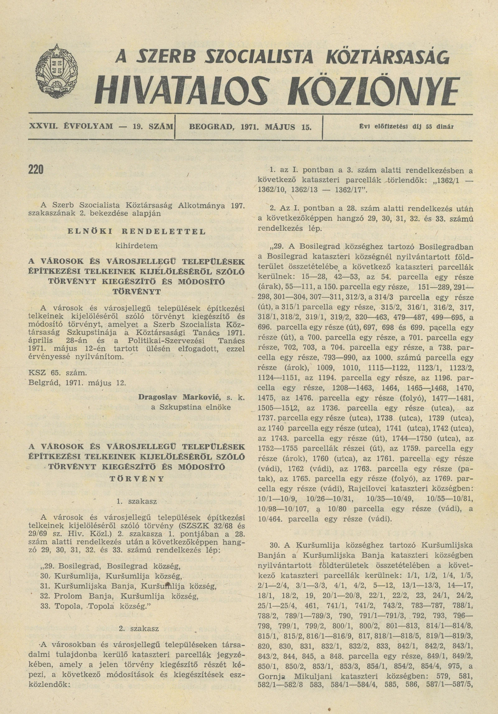 A Szerb Szocialista Köztársaság Hivatalos Közlönye, 27. évf. 1971. május 15. 19. sz. 433–436. oldal