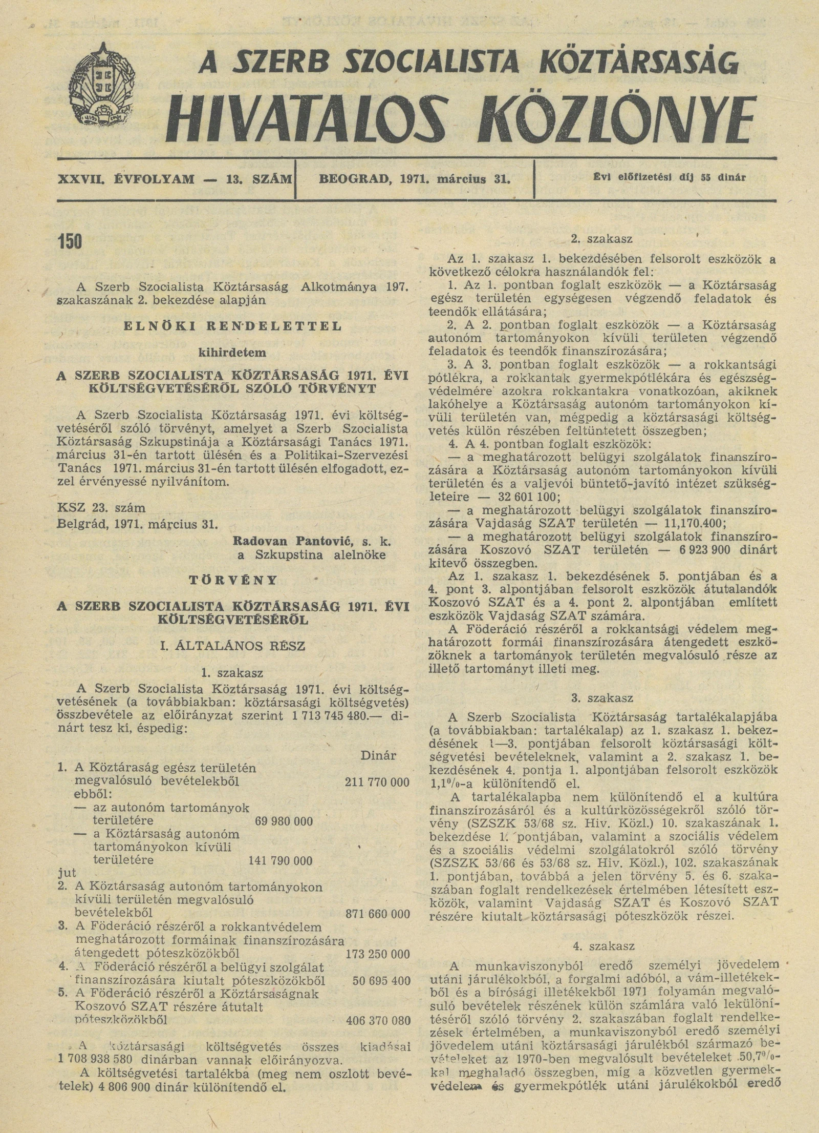 - Törvény a Szerb Szocialista Köztársaság 1971. évi költségvetéséről289