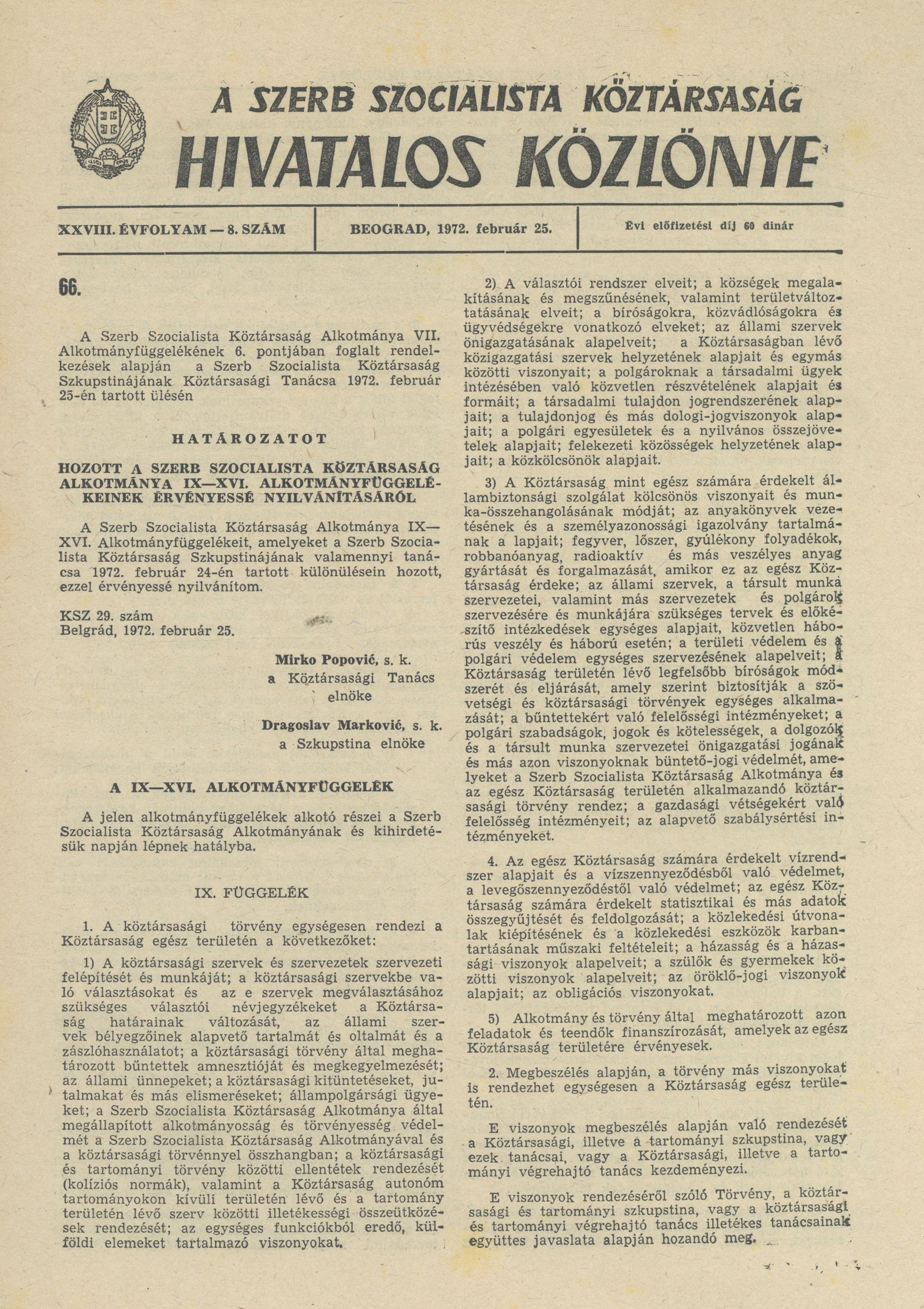 A Szerb Szocialista Köztársaság Hivatalos Közlönye, 28. évf. 1972. február 25. 8. sz. 225–240. oldal