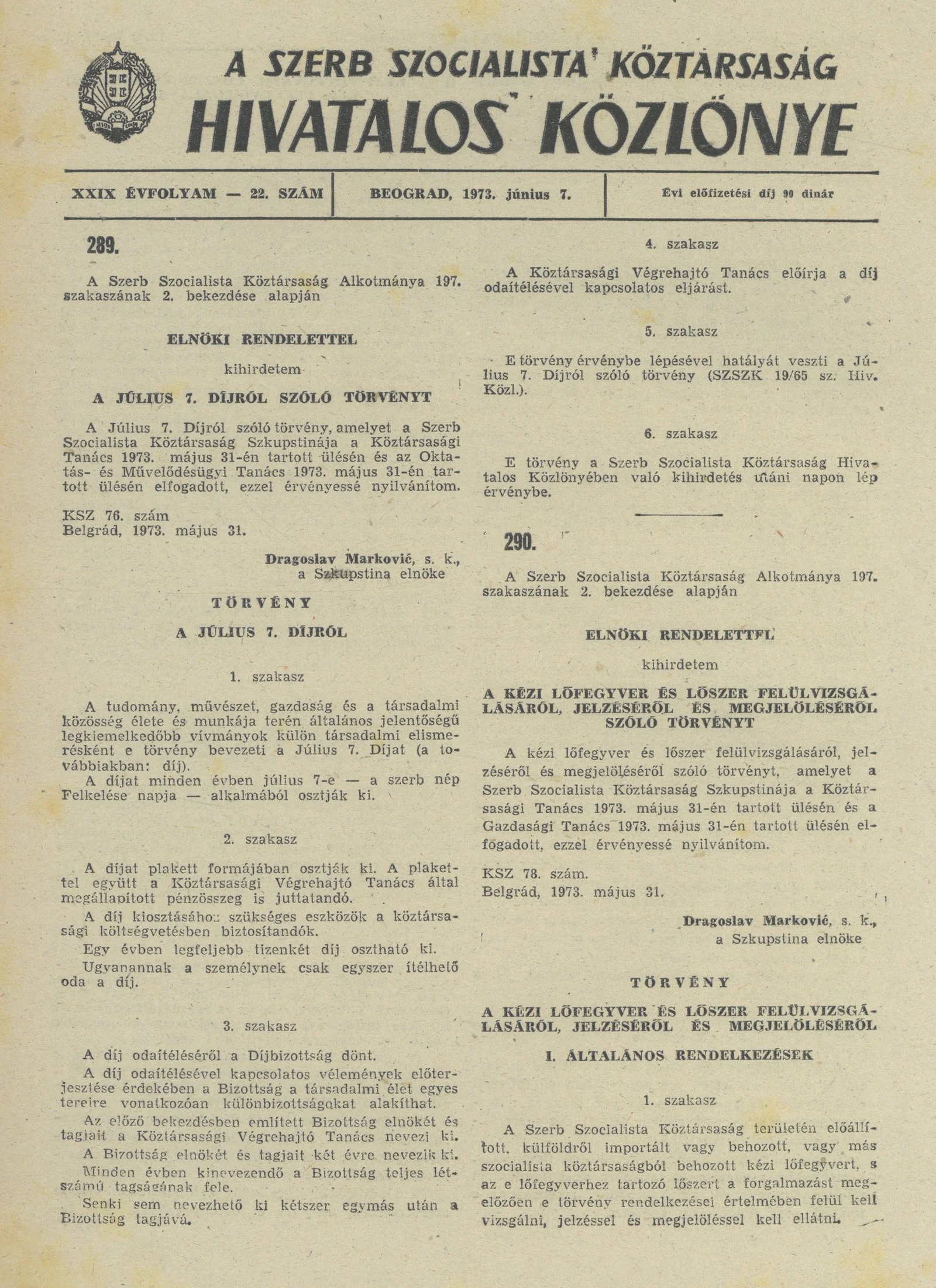 A Szerb Szocialista Köztársaság Hivatalos Közlönye, 29. évf. 1973. június 7. 22. sz. 689–704. oldal
